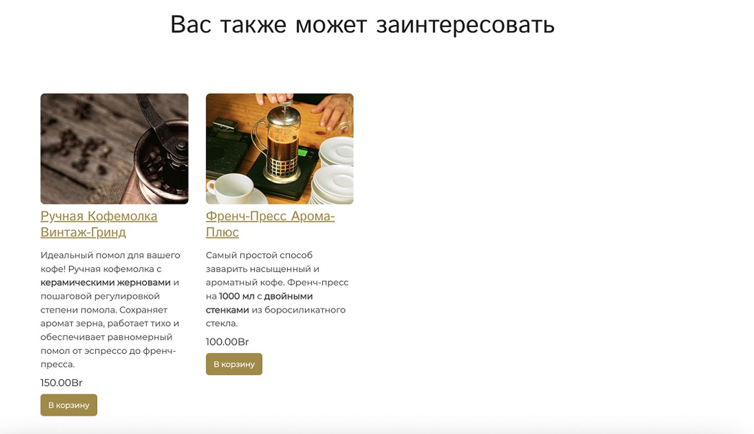 Такие блоки можно использовать, чтобы показывать, какие товары можно купить вместе с тем, который сейчас просматривает посетитель вашего сайта, или какие товары похожи на текущий товар. Сетка похожих товаров отображает 4 товара в ряду.
