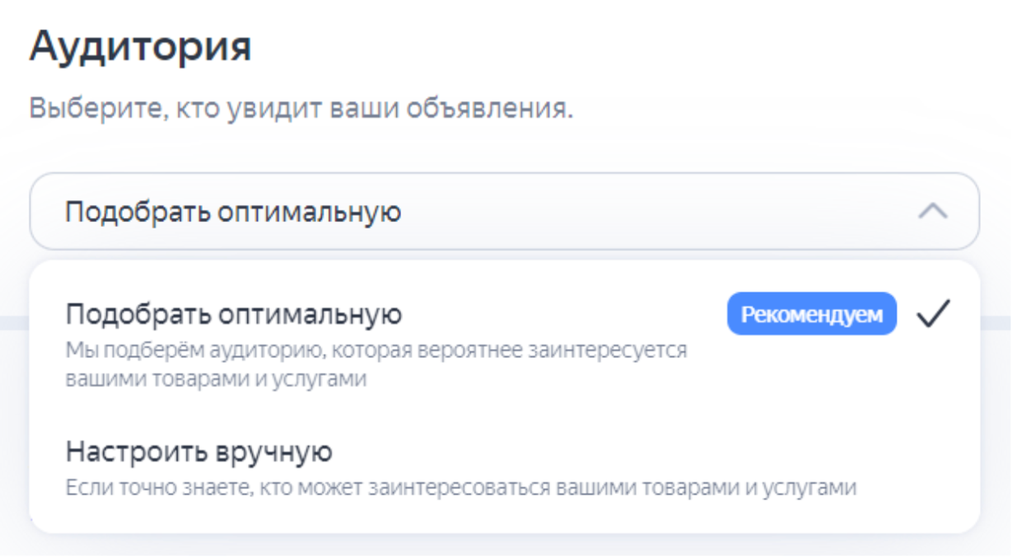 Вы можете как оставить рекомендуемую мастером кампаний опцию «Подобрать оптимальную», тем самым вы доверитесь умным алгоритмам Яндекс Директ и позволите подобрать аудиторию на основе данных, которые вы указали ранее и информации с вашего сайта.