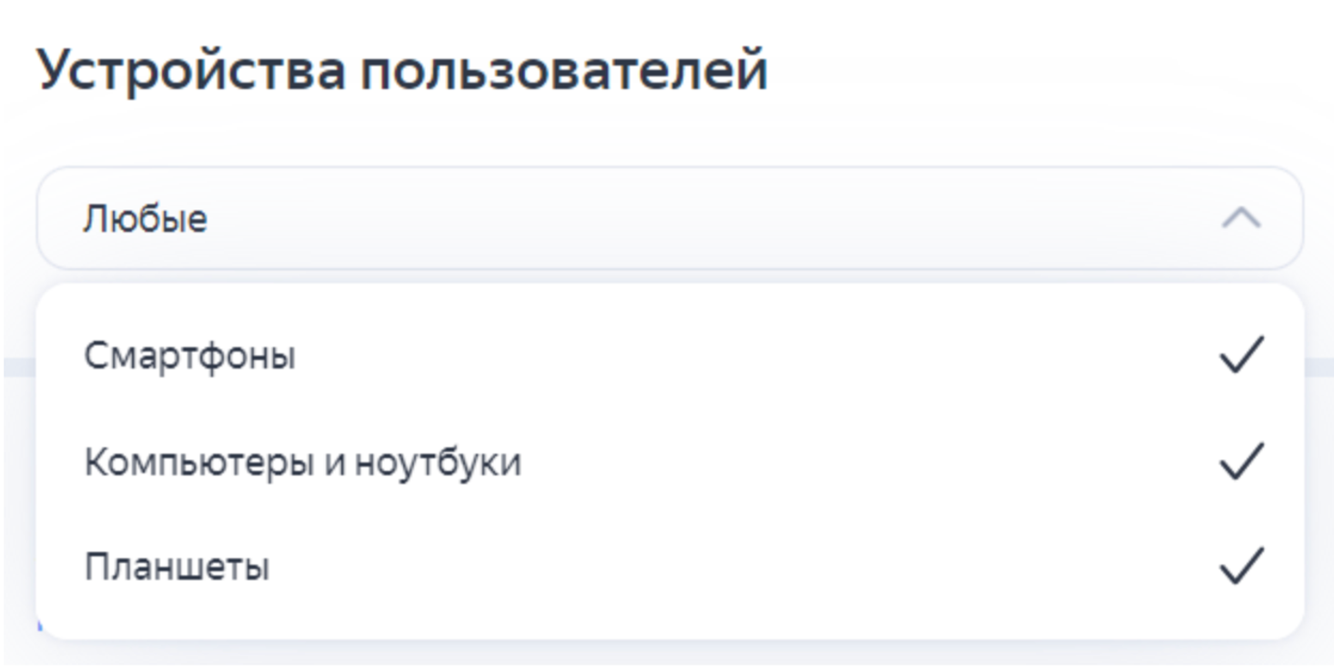 - Осталось выбрать тип устройств, на которых будет показываться ваша реклама. Это могут быть смартфоны, компьютеры, планшеты или все виды устройств сразу.