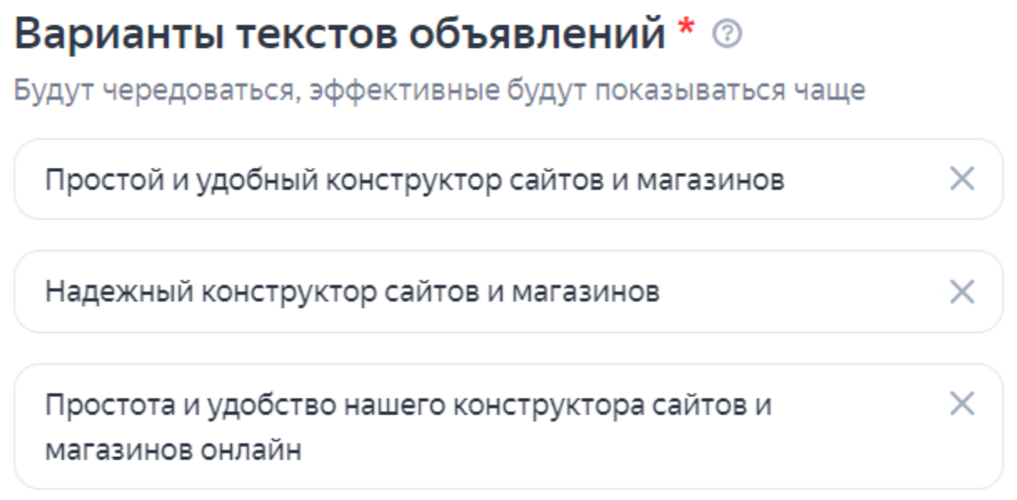 Умные алгоритмы мастера кампаний Яндекс Директ предложат вам несколько вариантов. Вы можете оставить их, заменить или добавить свои.
