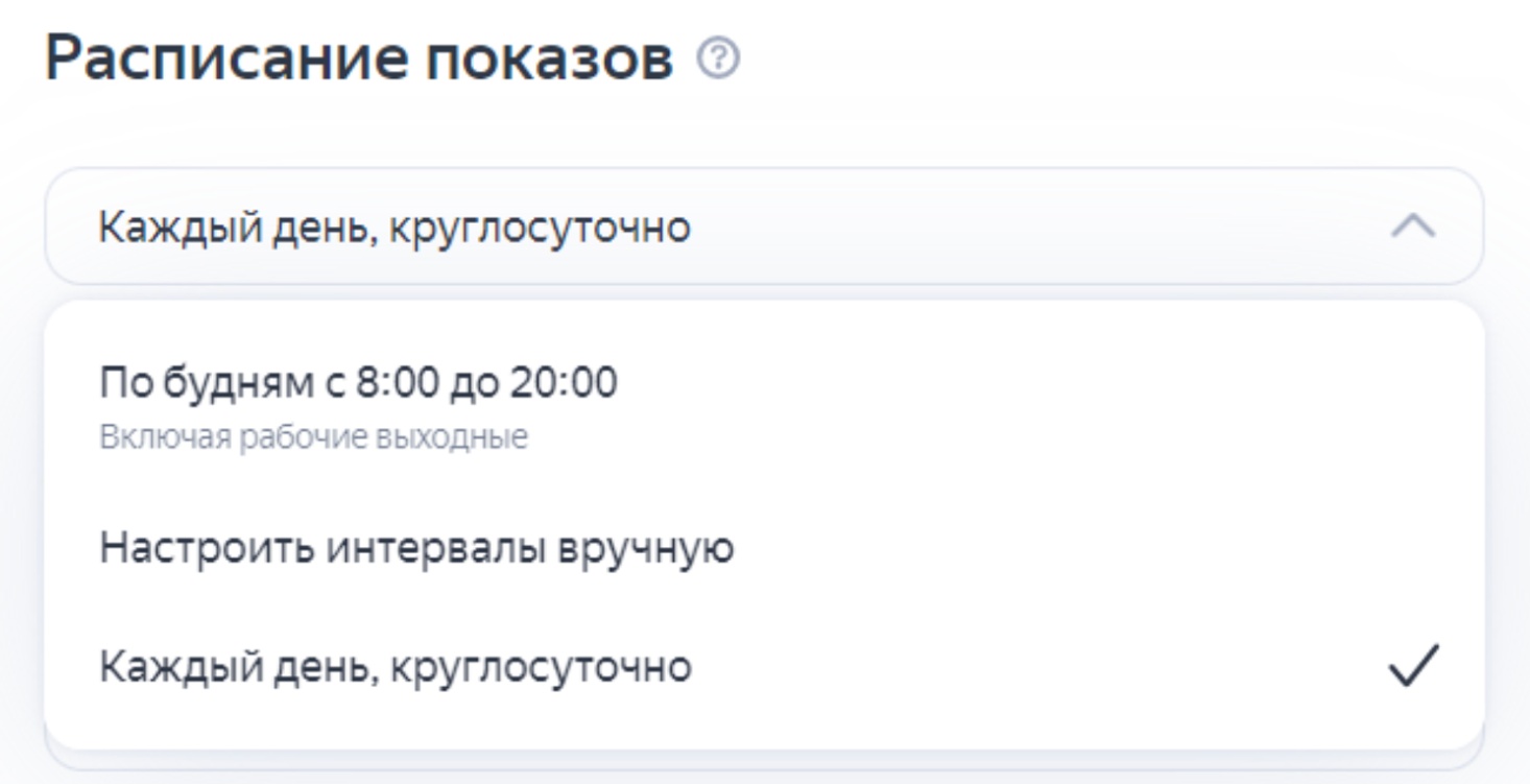Укажите, когда необходимо показывать ваши объявления, вы можете оставить опцию по умолчанию и показывать рекламу ежедневно и круглосуточно, можете выбрать вариант показа по будним дням в рабочее время или настроить удобное для вас время вручную.