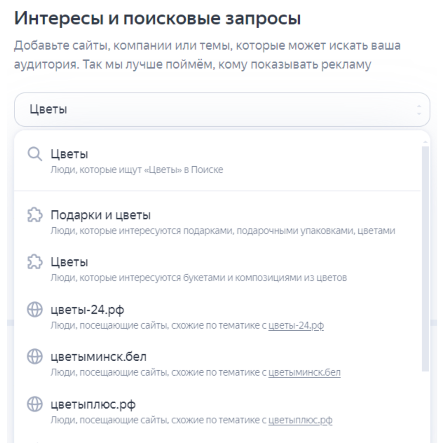 - Выберите интересы вашей аудитории. Вы можете ввести как ключевое слово, которое потенциальный клиент может ввести в поиск, так и домены сайтов (например конкурентов), которые клиент может посещать. Также вы можете выбрать уже готовый интерес.