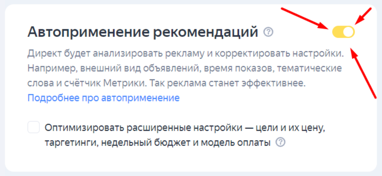 Позвольте умным алгоритмам Яндекс Директ анализировать и оптимизировать настройки вашей рекламы без вашего участия. Просто переведите тумблер активации слева направо в активное положение. Его цвет изменится с серого на желтый.