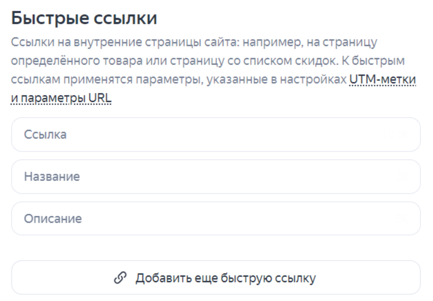 В этом разделе вы можете добавить дополнительные ссылки на другие страницы вашего сайта, не только на ту, которую вы отметили при начале настройки. Это могут быть страницы с ценами, акционные лендинги, галерея товаров или страница с контактами.