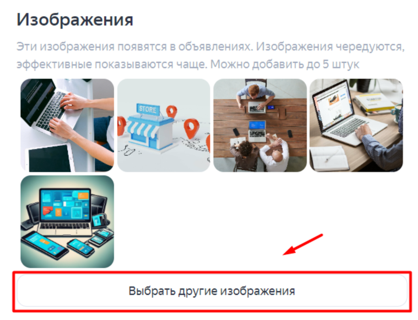 По умолчанию мастер кампаний Яндекс Директ подтягивает изображения, размещенные в их собственном Фотобанке. Если вы хотите заменить или добавить другие картинки - нажмите на кнопку «Выбрать другие изображения».