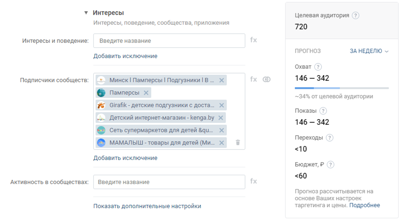 Или показывать рекламу не по интересам, а **подписчикам определенных тематических групп**. Обратите внимание, что при этом показатели нашей аудитории тоже изменились.