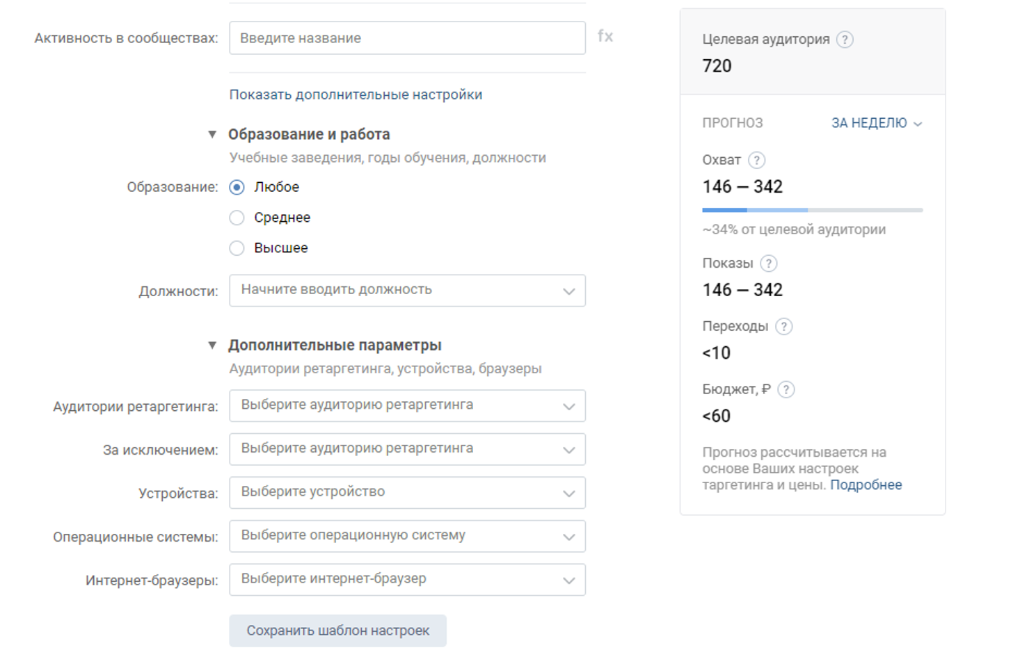 Также мы можем настроить и показывать рекламу для тех, кто ведет себя активно в определенных группа (лайкает, комментирует и т.д.), а также отфильтровать аудиторию по признаку «Образование и работа» (если это существенно), по «Дополнительным параметрам» и т.д.