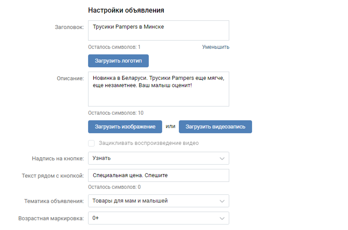 Заполняем тематику объявления (на ваше усмотрение) — «Товары для мам и детей» и маркировку по возрасту (0+). Объявление готово.