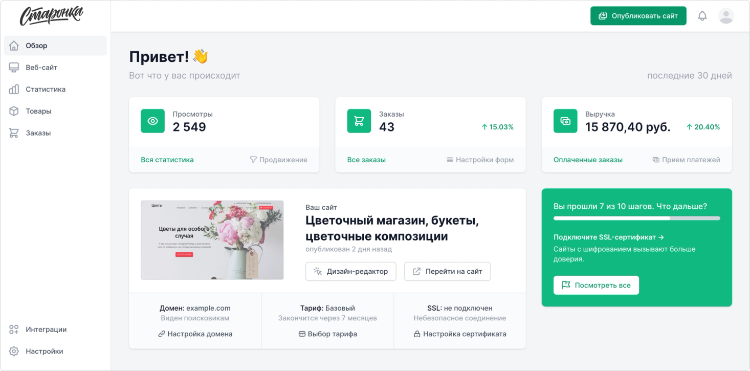 - Дашборд — это первая страница, которую вы видите, когда входите внутрь вашего сайта. Теперь он показывает базовую информацию о сайте и основные показатели, как ваш сайт работал последние 30 дней: просмотры страниц, заказы, выручка. Всегда будьте в курсе того, что происходит! Кроме того, там появился помощник по запуску сайта, который расскажет, что надо настроить для успешного продвижения в интернете.