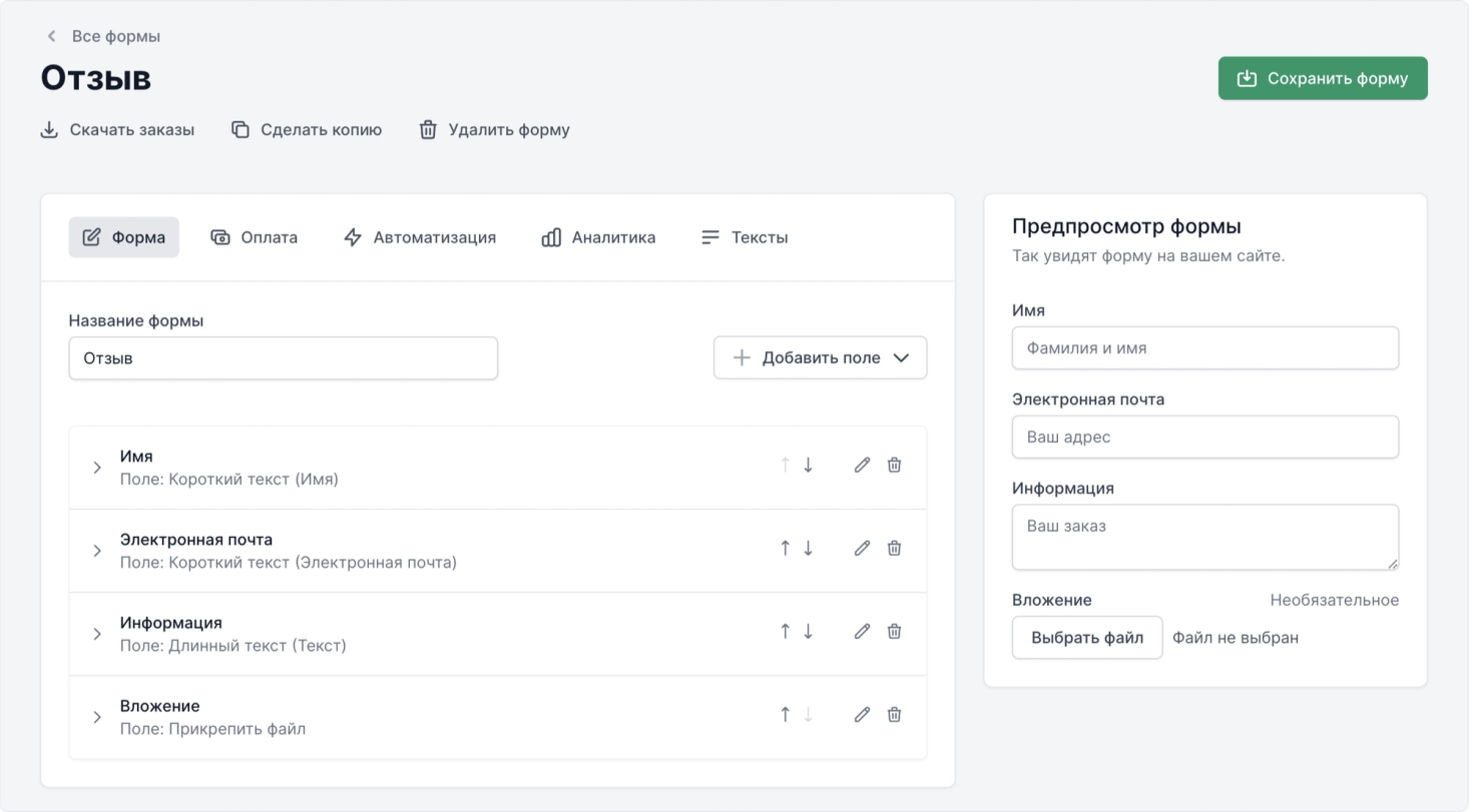 - Управление формами. Мы переработали подход к конструктору форм, добавили несколько самых частых полей и явно выделили настройку автоматических действий после заполнения формы вашими клиентами. Это позволяет легко настраивать онлайн оплаты, события в аналитических системах и уведомления после заказа.
