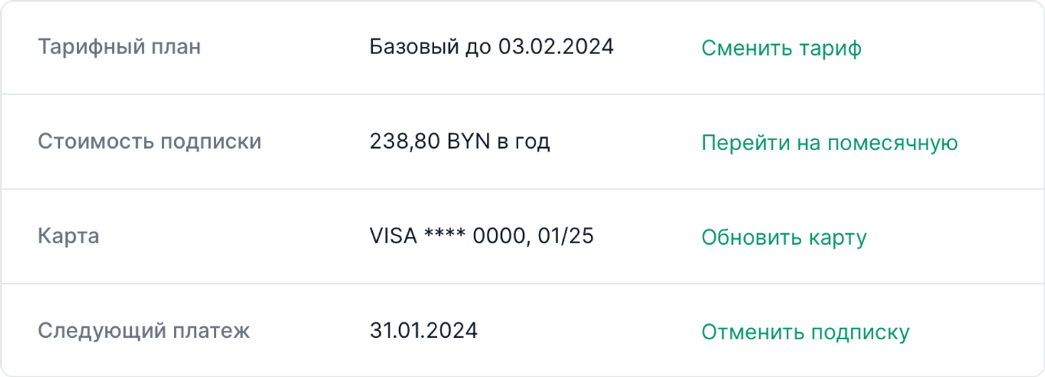 Всё совершенно безопасно — мы не храним данные вашей карты у себя, а используем для этого надёжные платежные сервисы: bePaid и ЮKassa. С их помощью мы можем регулярно автоматически проводить оплаты (ежегодно или ежемесячно), чтобы работа вашего дела никогда не останавливалась из-за забытого платежа.