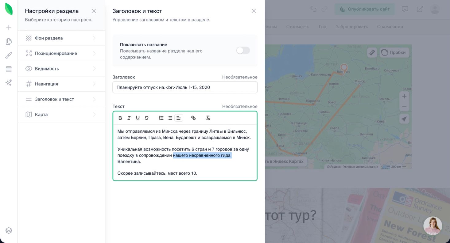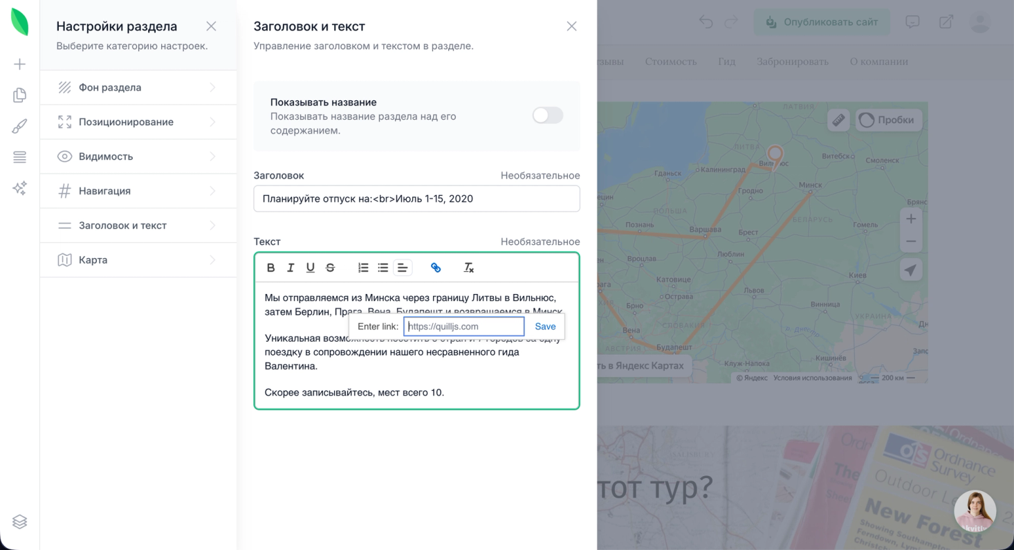 Чтобы добавить ссылку в любой текст на сайте, перейдите в настройки раздела, выделите слово или сочетание слов