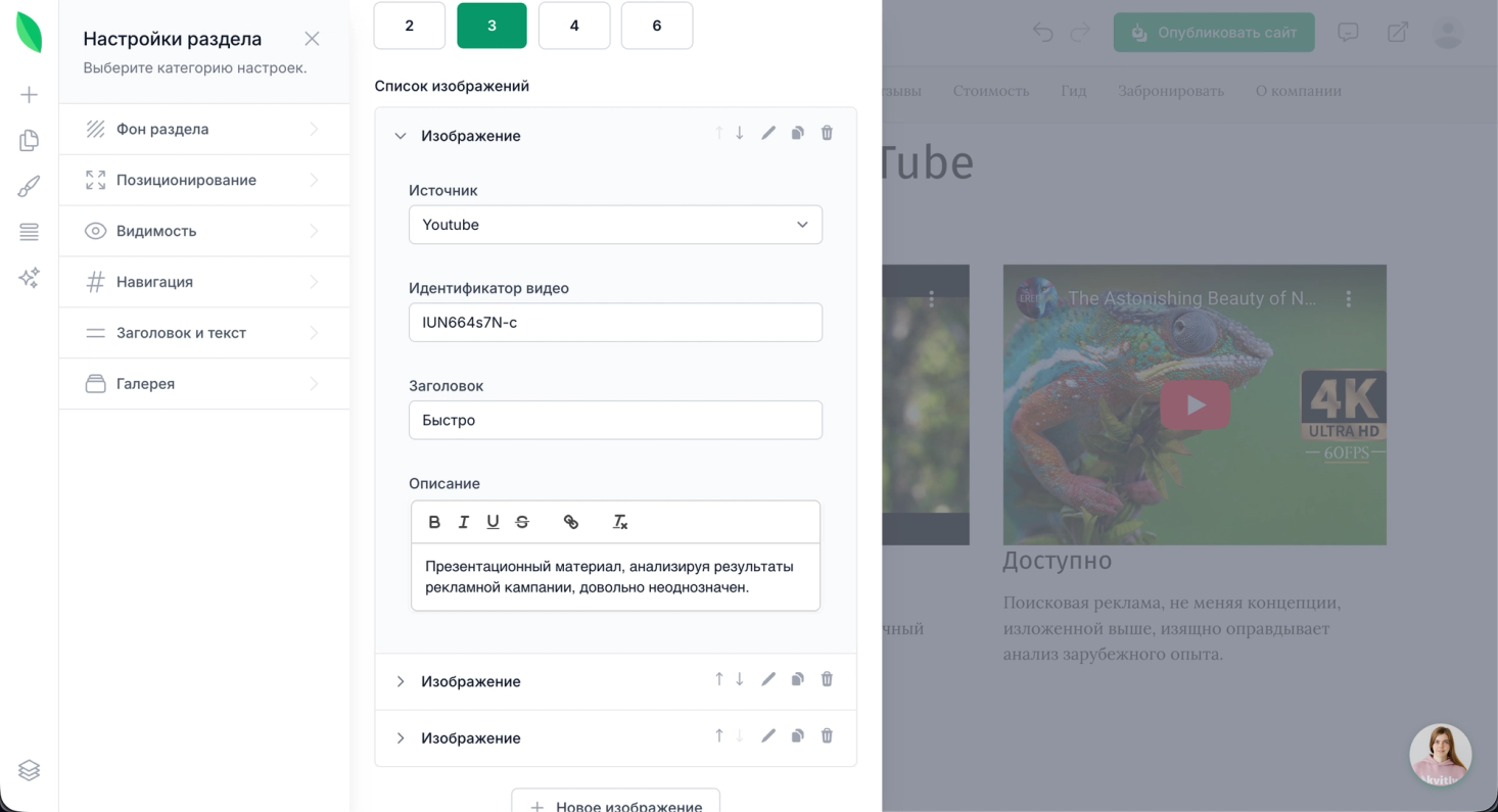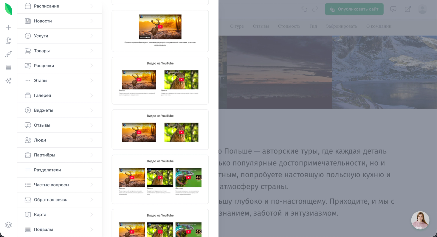 Чтобы добавить на сайт видео с «YouTube», нужно добавить один из разделов, который содержит виджеты.