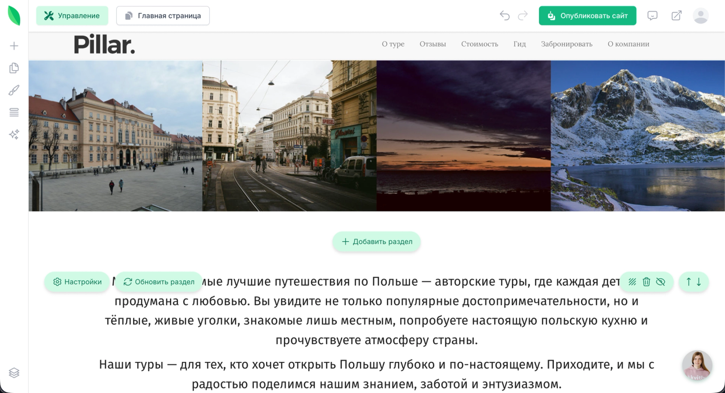 В редакторе сайта нажмите на кнопку «Добавить раздел»