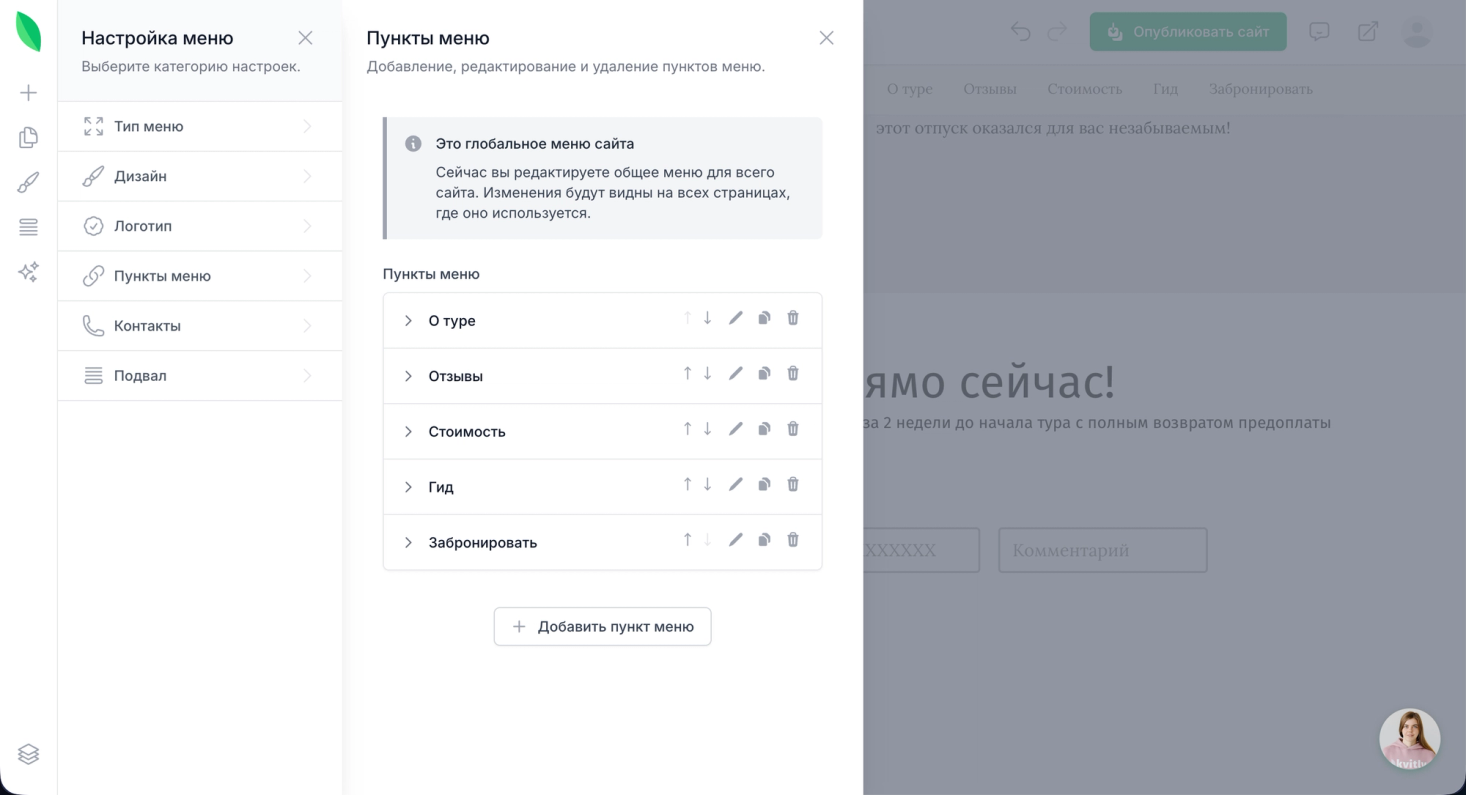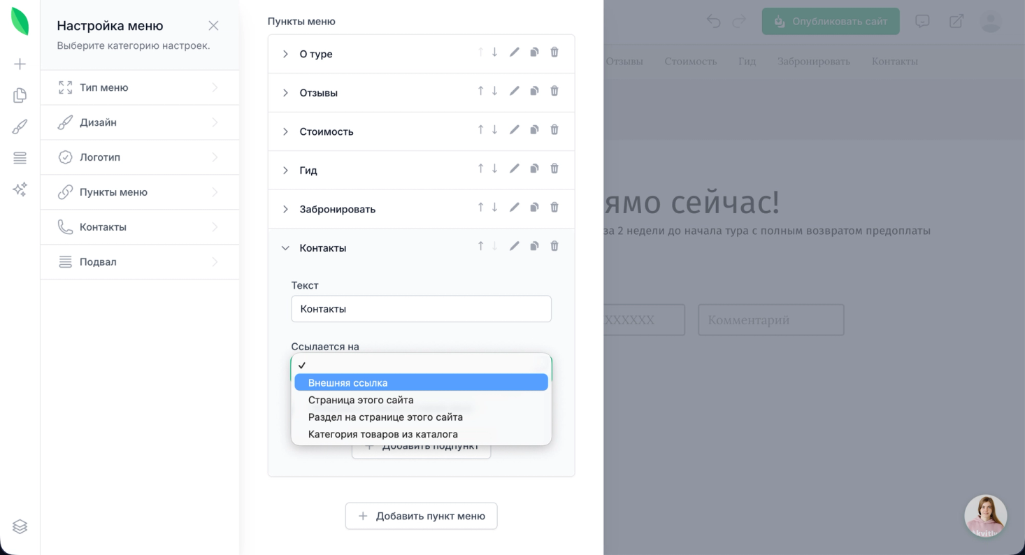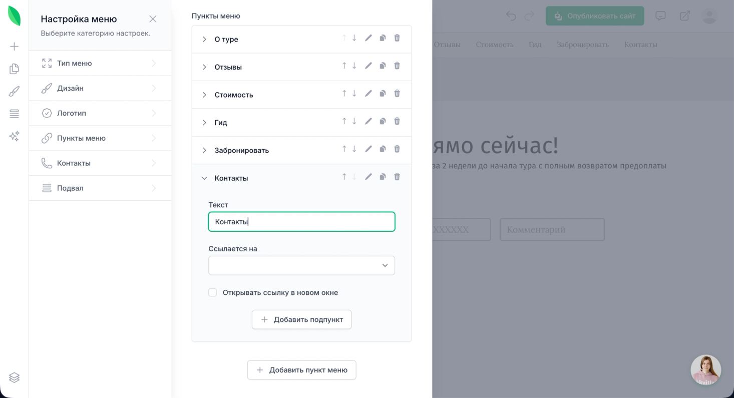 Чтобы добавить новый пункт в «Меню сайта», нажмите на кнопку «Меню и подвал» и выберите раздел «Пункты меню»