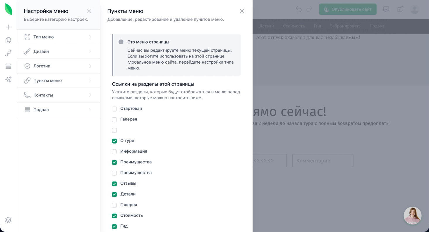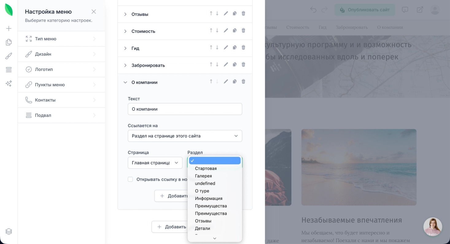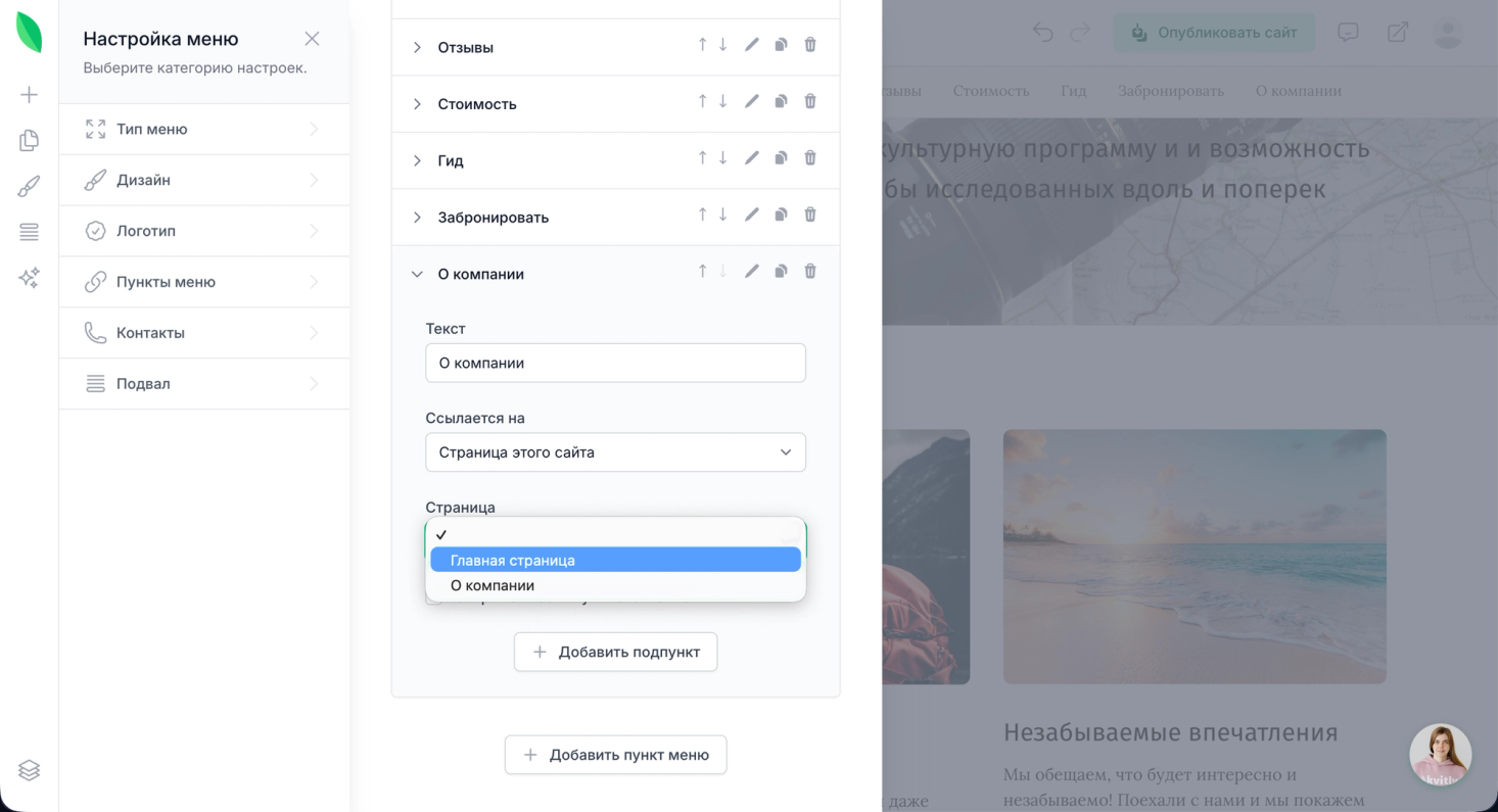 Чтобы добавить новый пункт в «Меню сайта», нажмите на кнопку «Меню и подвал» и выберите раздел «Пункты меню»