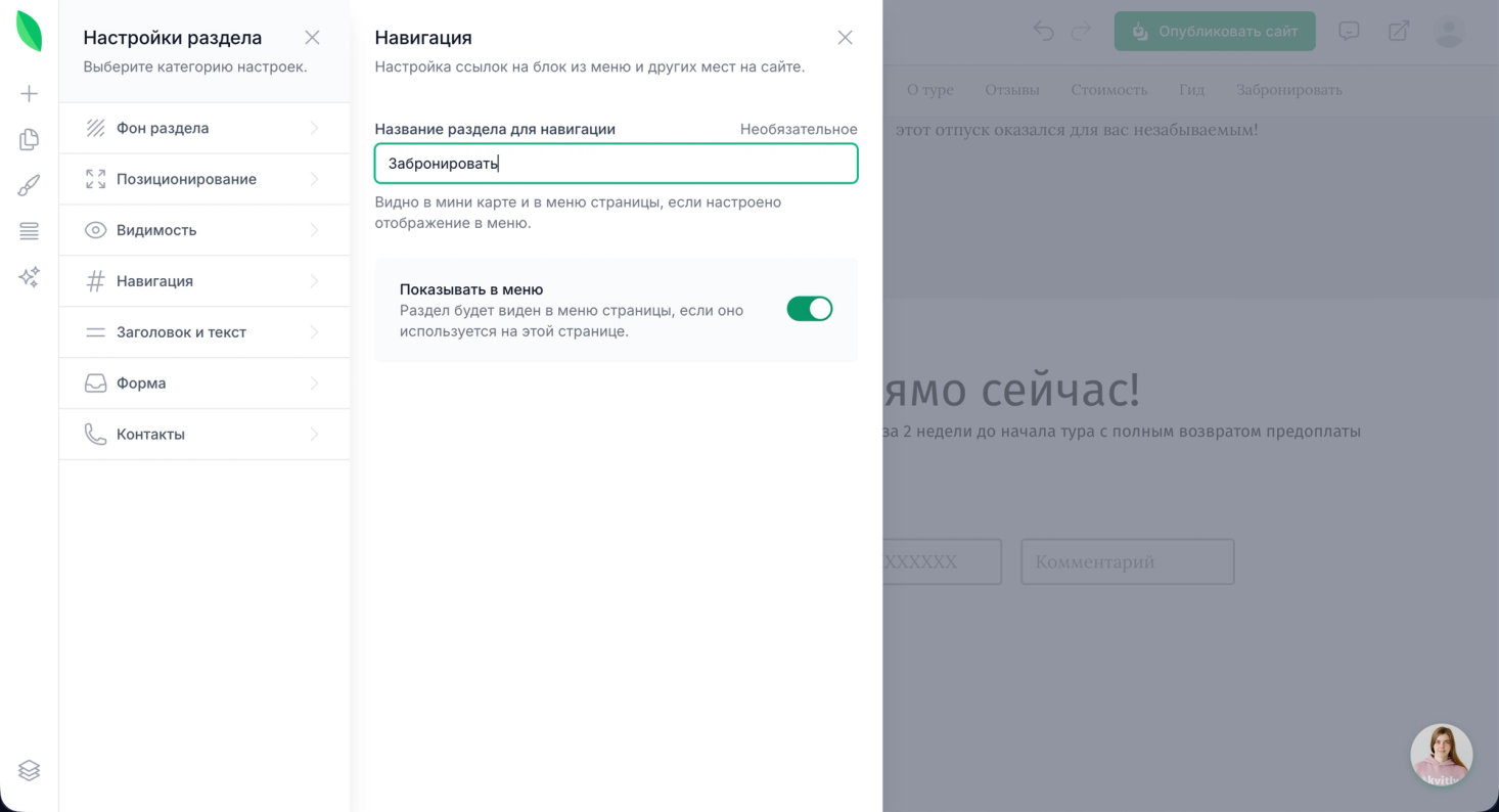 Название пункта можно изменить в настройках каждого раздела. Если вам потребуется его отредактировать, нажмите на кнопку «Настройки» в левом верхнем углу рабочей области выбранного раздела. А после, перейдите в раздел «Навигация», в поле «Название раздела для навигации» измените текст.