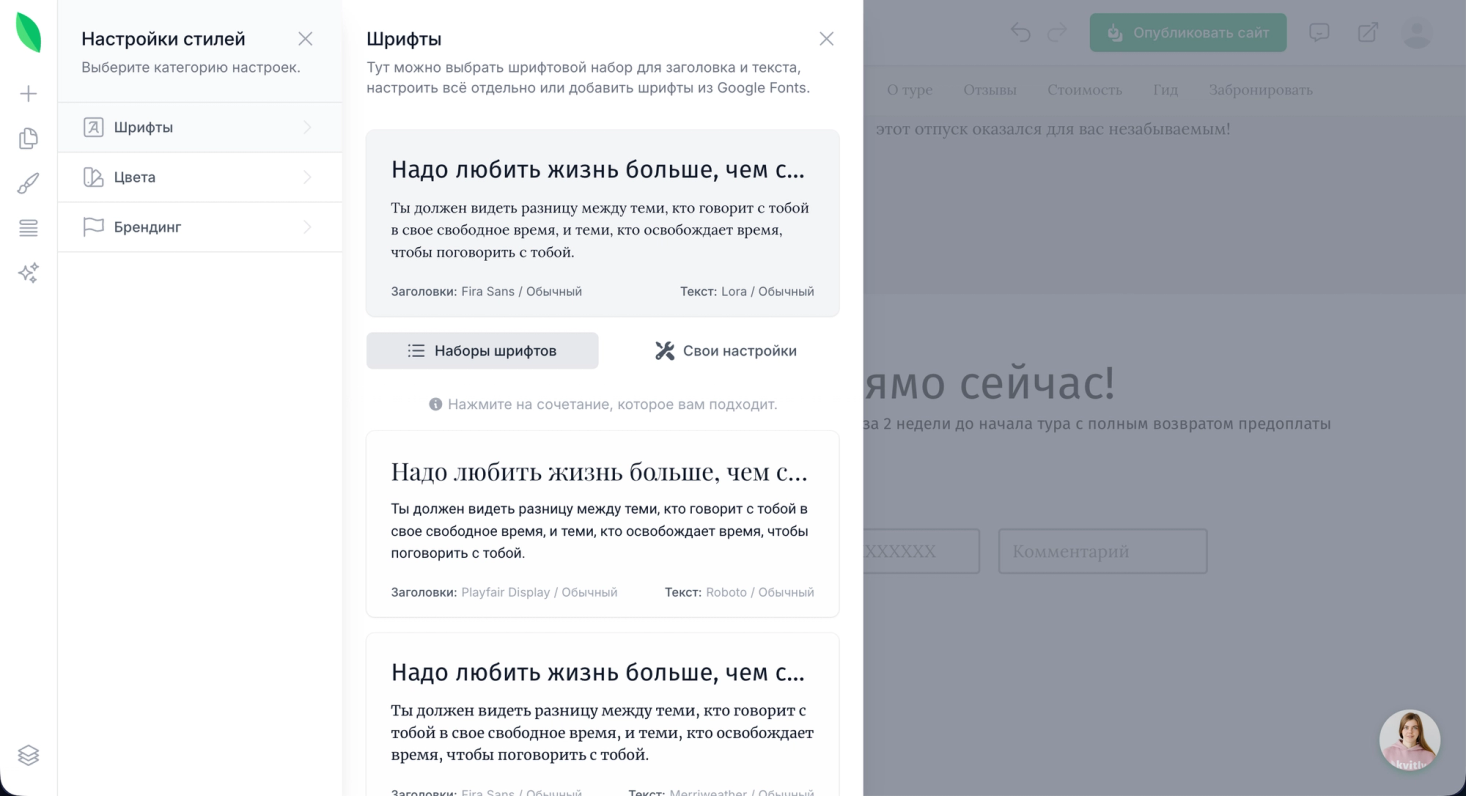 Здесь вы можете выбрать одно из готовых сочетаний шрифтов для заголовков и основного текста из нашей коллекции, либо подобрать свое сочетание шрифтов из предложенного нашими дизайнерами списка, либо добавить свой шрифт из библиотеки Google fonts.