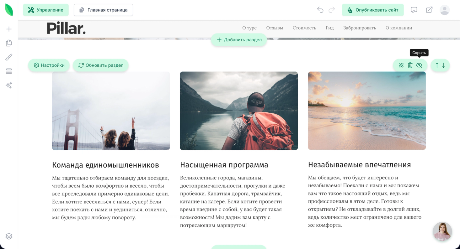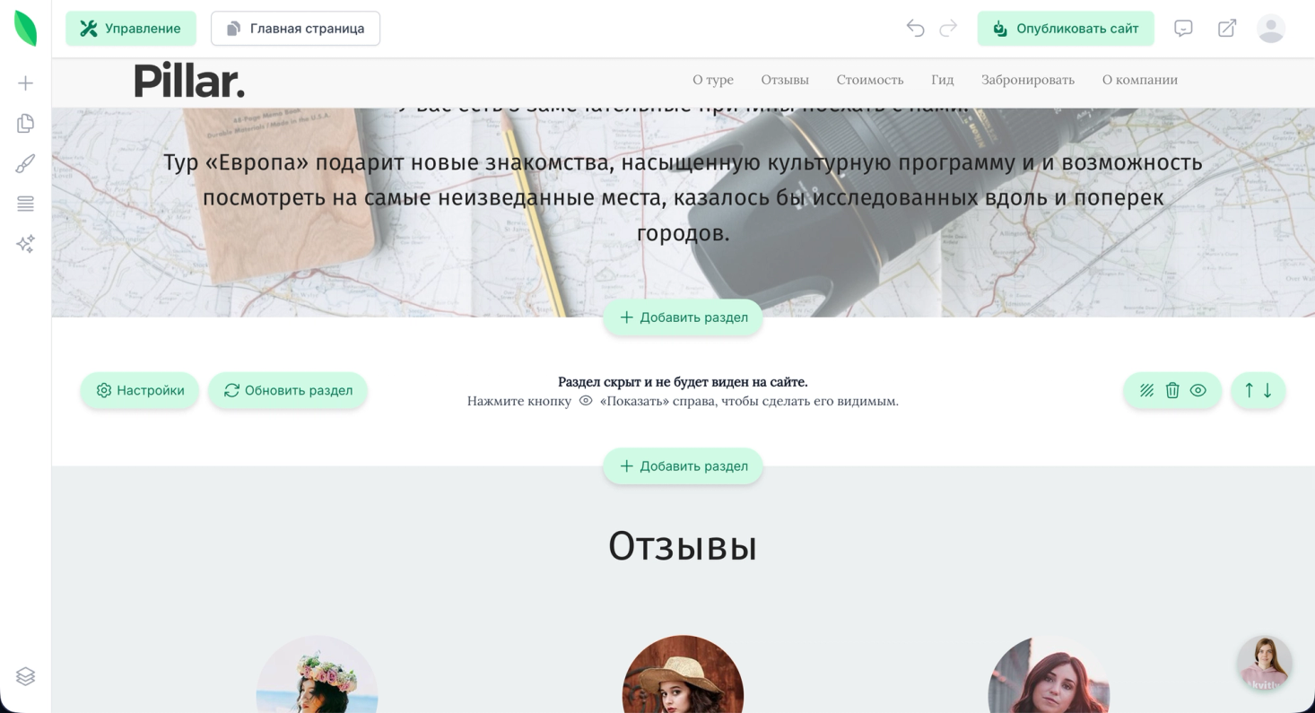 Чтобы скрыть раздел, нажмите на иконку перечеркнутого глаза в правом верхнем углу