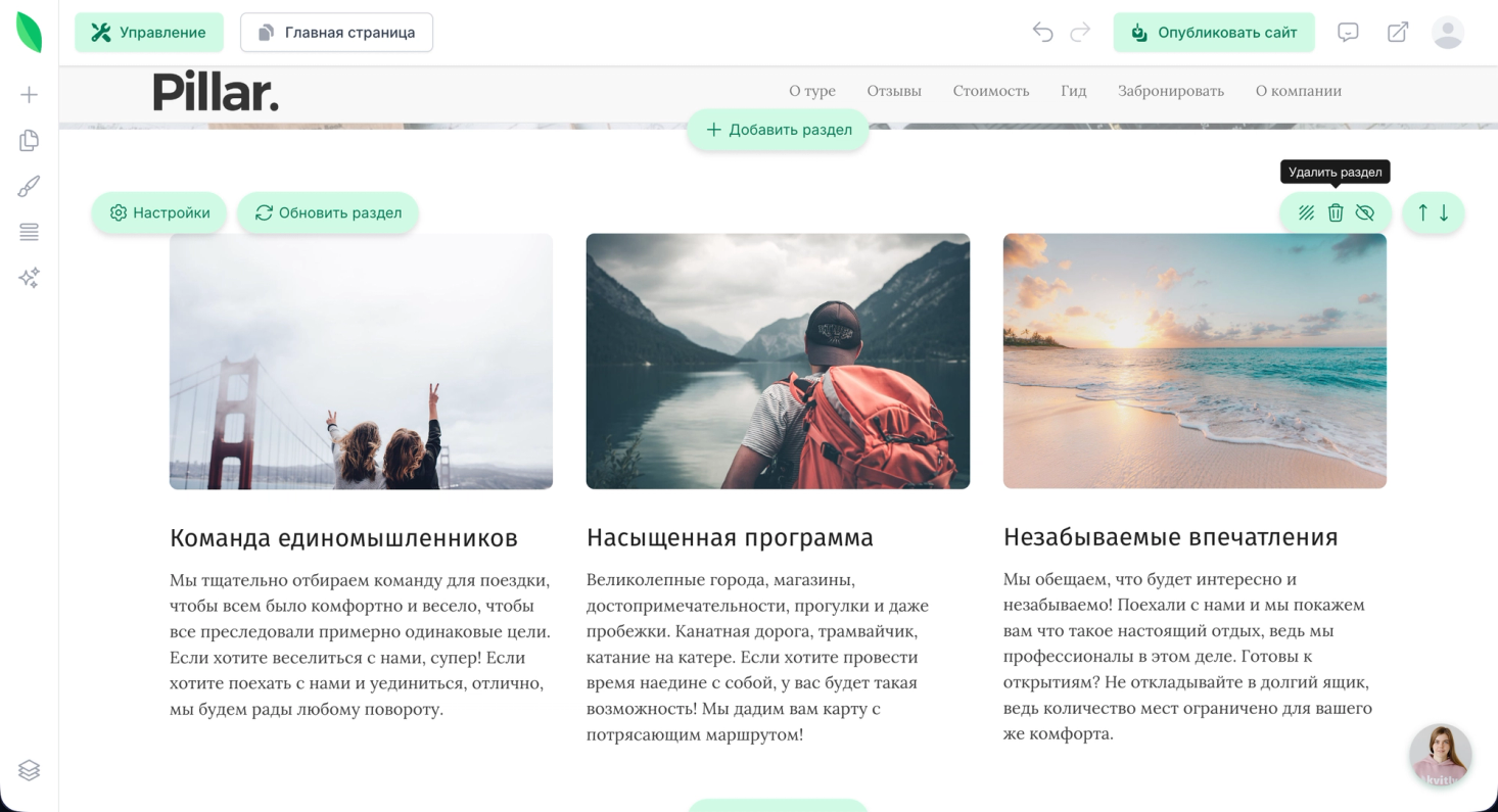 Чтобы удалить раздел, нажмите на кнопку корзины в правом верхнем углу.