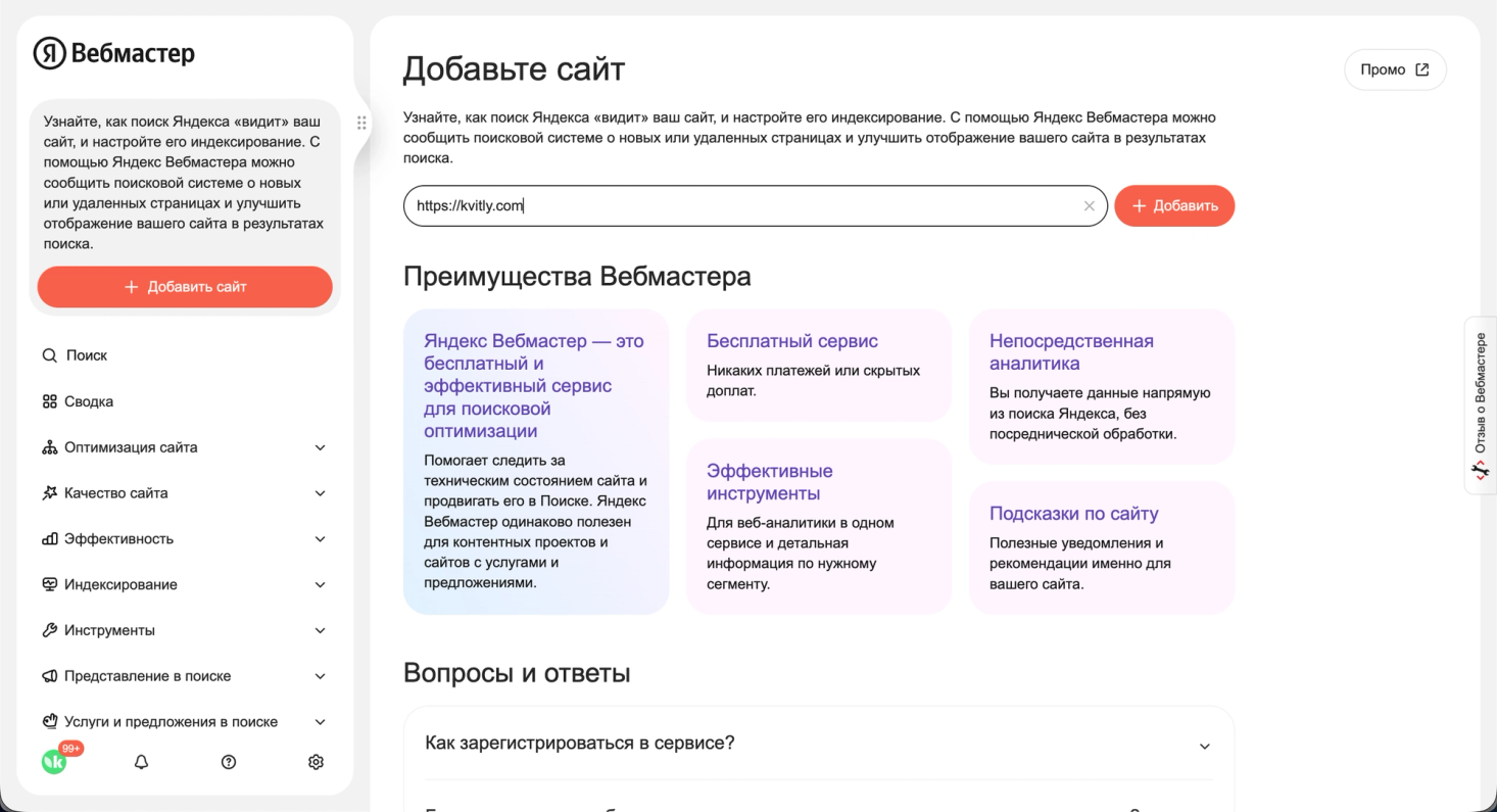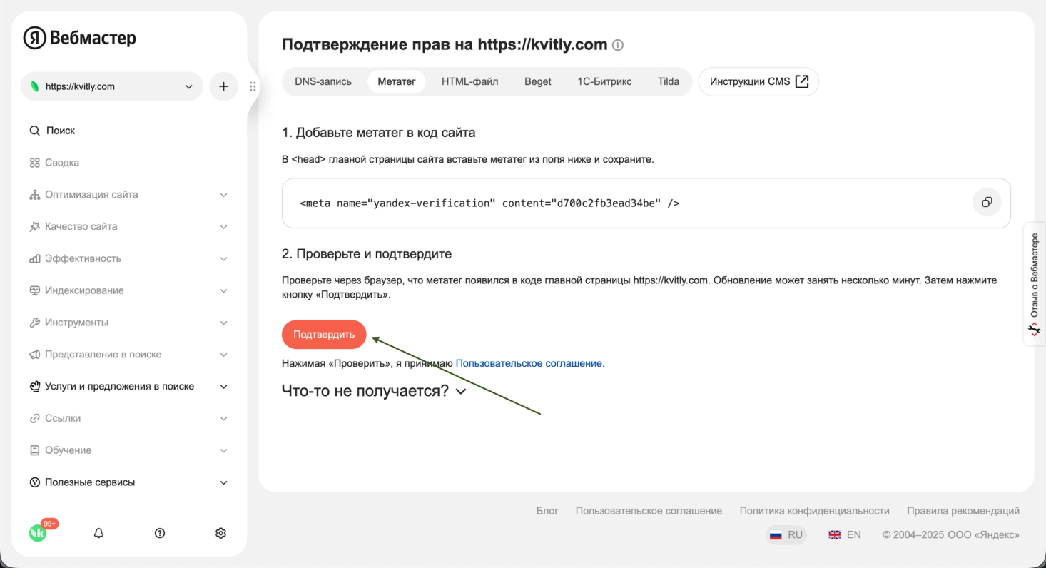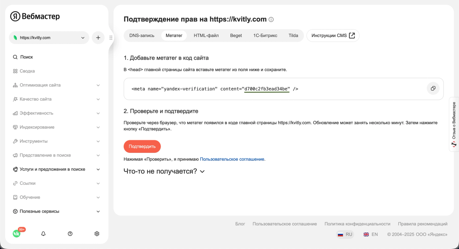 Яндекс.Вебмастер — подтверждение прав на сайт