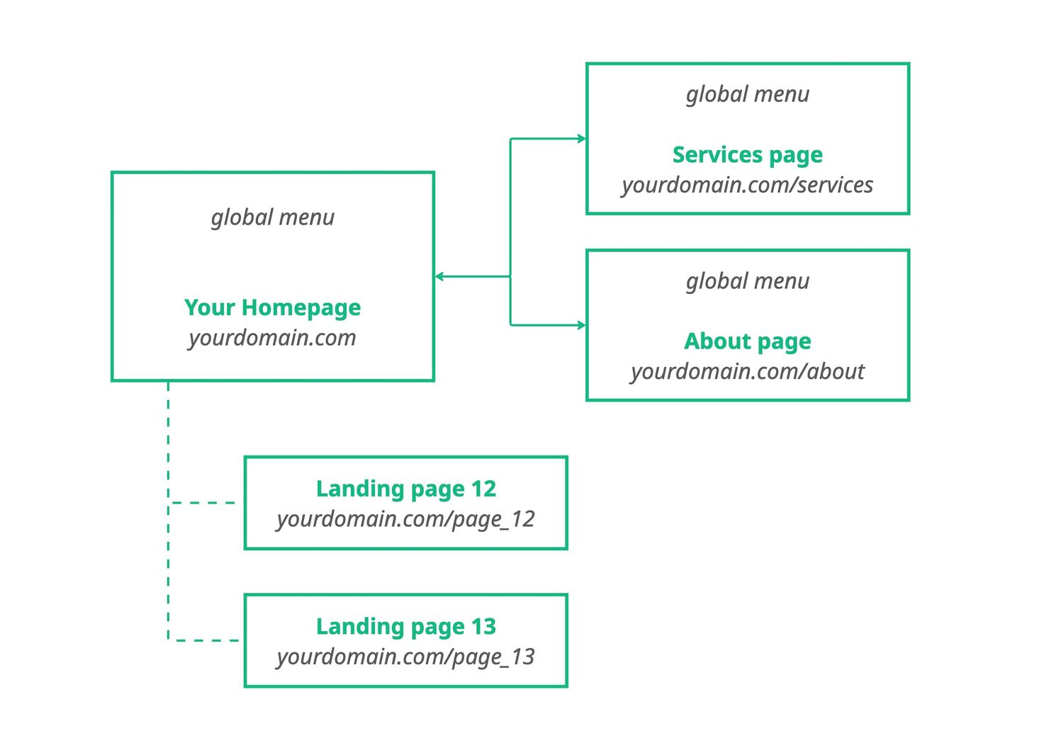 Here's how it counts: If your plan includes 100 pages, you can create 100 pages total – whether they have global navigation or not. You could build 100 different focused landing pages for various campaigns, and they'll all live at URLs like yourdomain.com/offer-1 or yourdomain.com/signup.