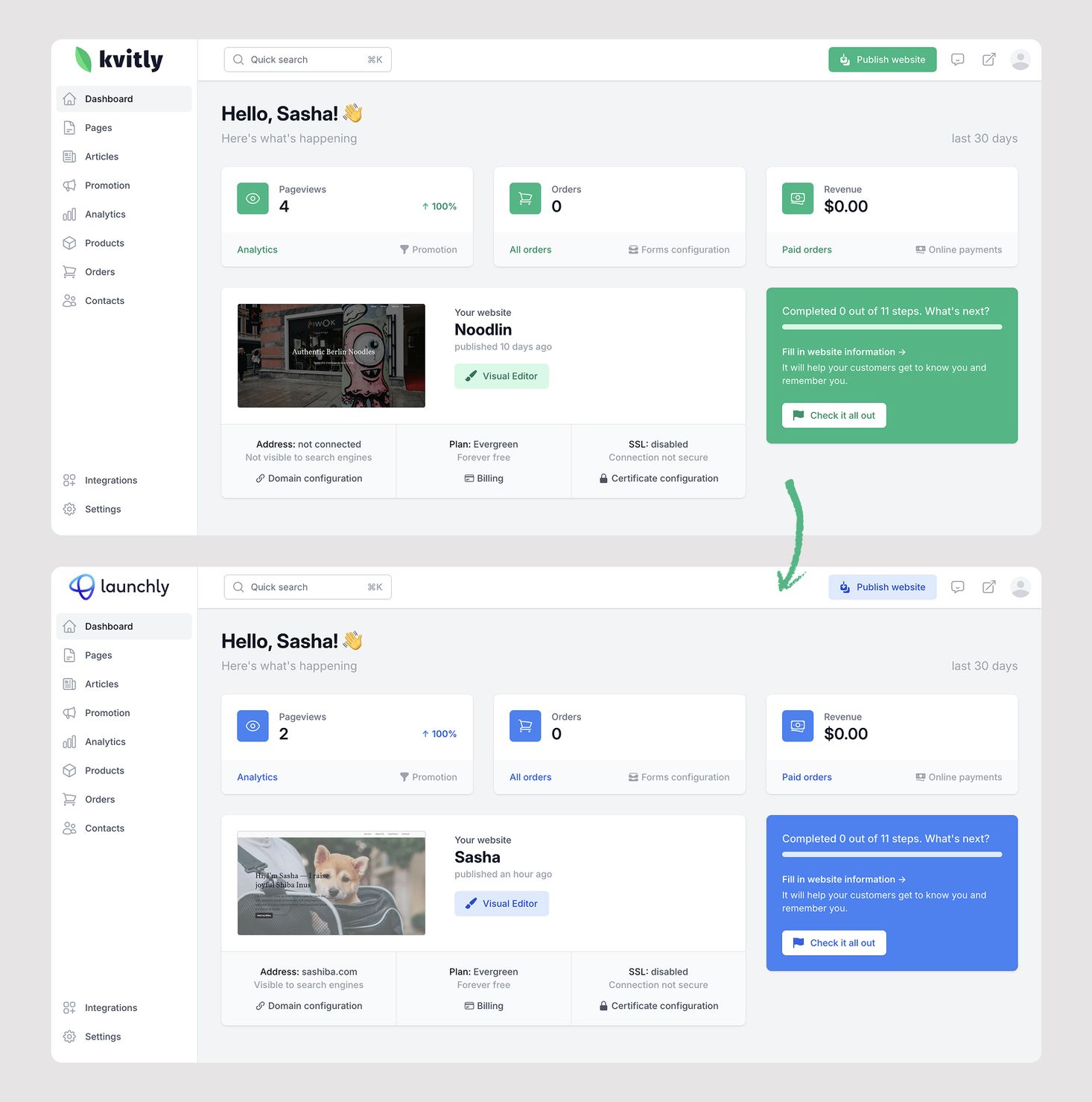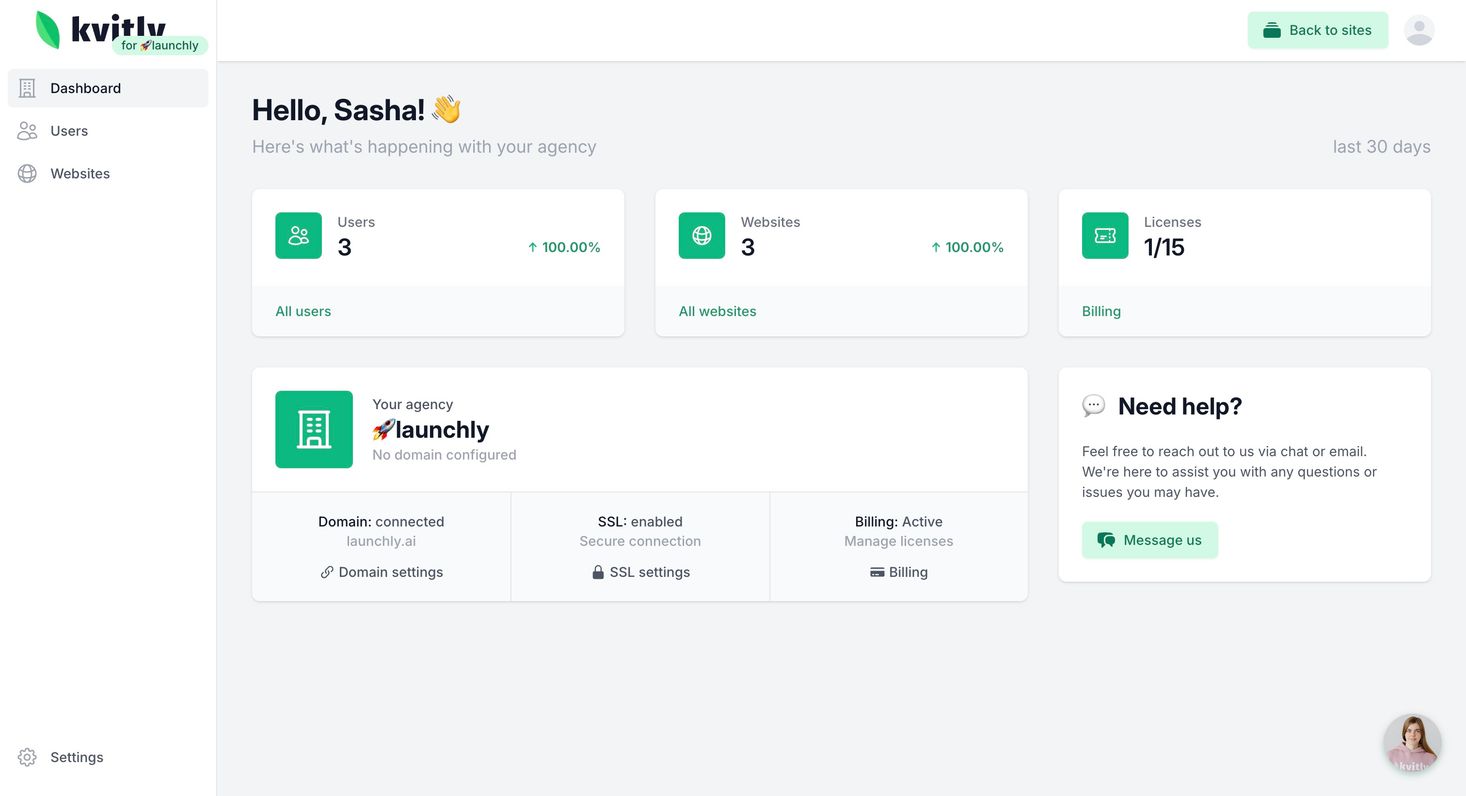 If you want to handle high-level management (like linking a site to a license), use the Agency Dashboard in 🌱kvitly. If you want to edit a site’s content, just log in to your own Agency Instance and edit the website right there.