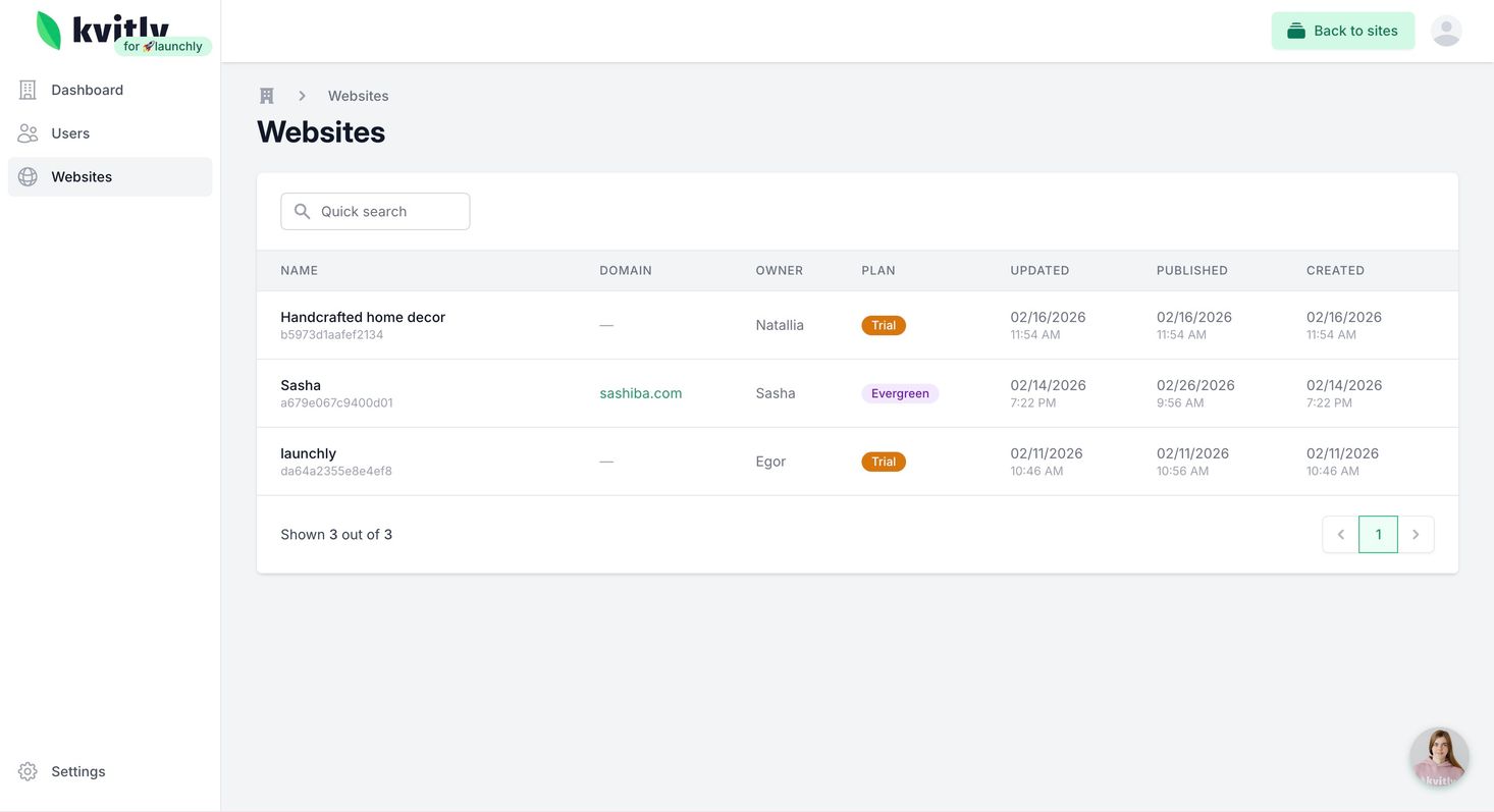 If you already have some websites created in 🌱kvitly and need to make them available in your Agency instance, they will be automatically available when we spin up your instance and link a license to it.