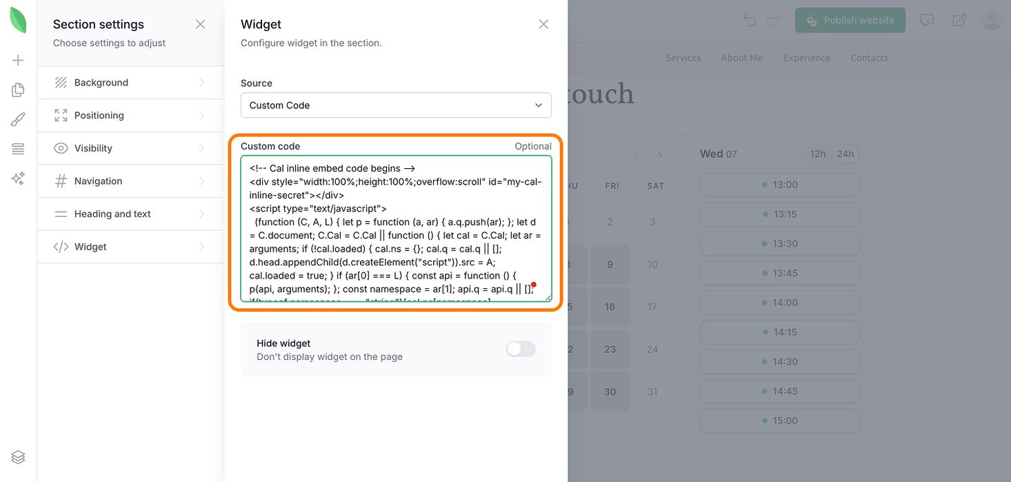 Enhance your website’s functionality by embedding external tools directly into your pages. Whether you want to add a custom form, a social media feed, or a specialized tool from another service, you can do so easily using the Widget section.