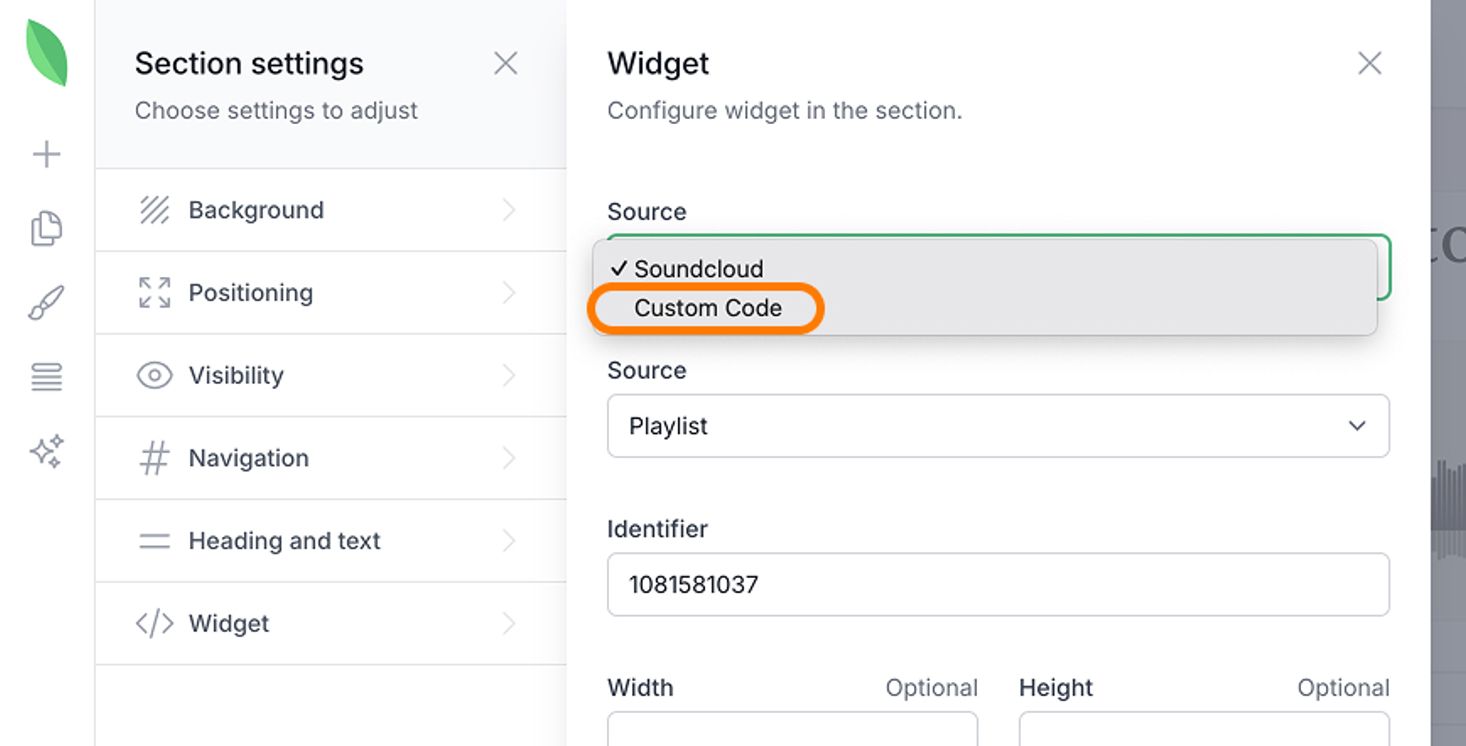 4. In the widget settings panel, find the Source option and select Custom Code.