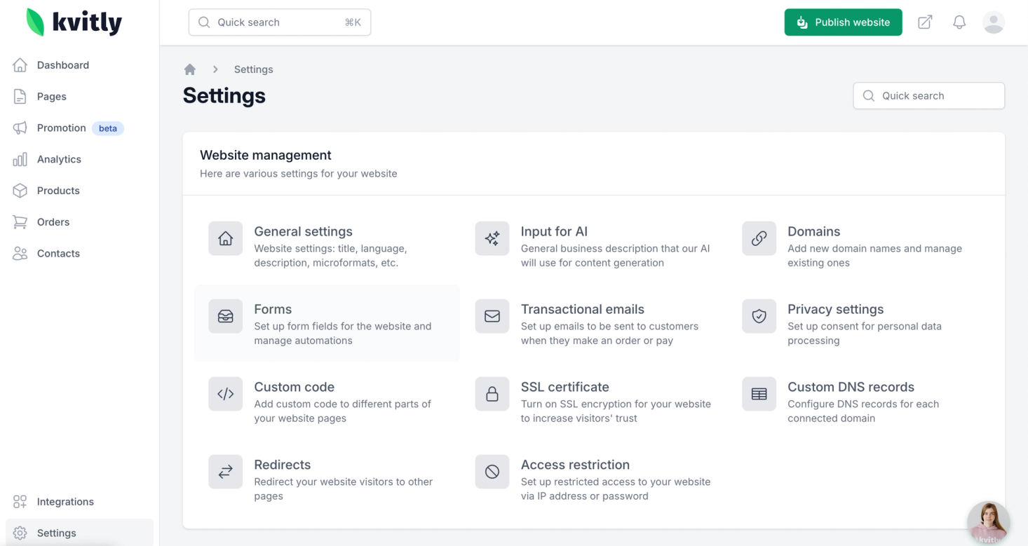 1. In your 🌱kvitly Dashboard Navigate to Settings → Forms.