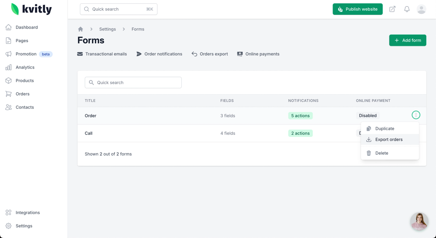 3. Click the three dots next to the form’s name and choose Export Orders.