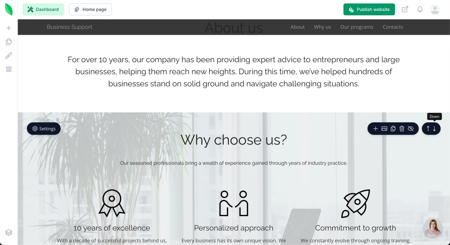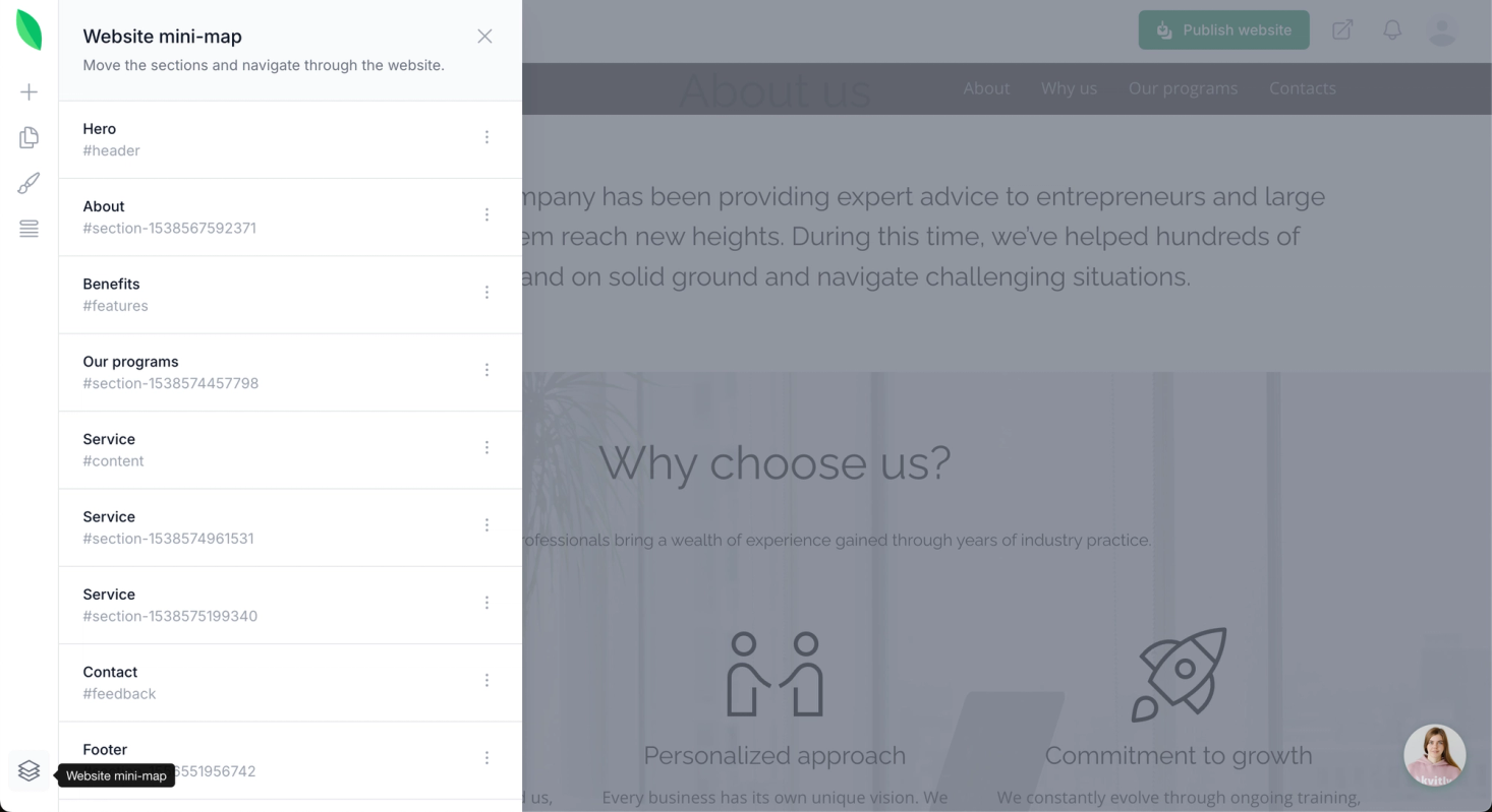 Alternatively, click the Website mini-map icon in the bottom-left corner of Visual Editor and drag the section up or down using your mouse.