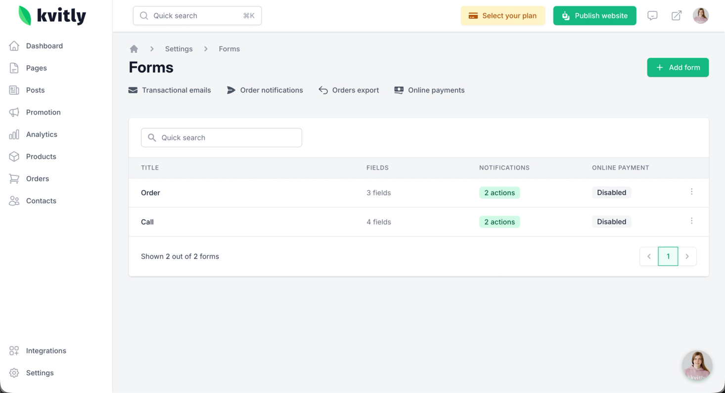 From your 🌱kvitly dashboard, go to the Dashboard → Forms configuration section