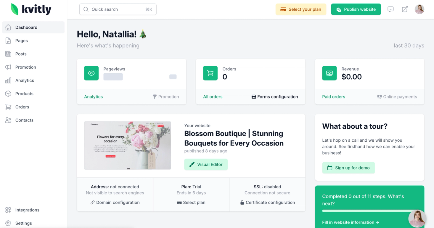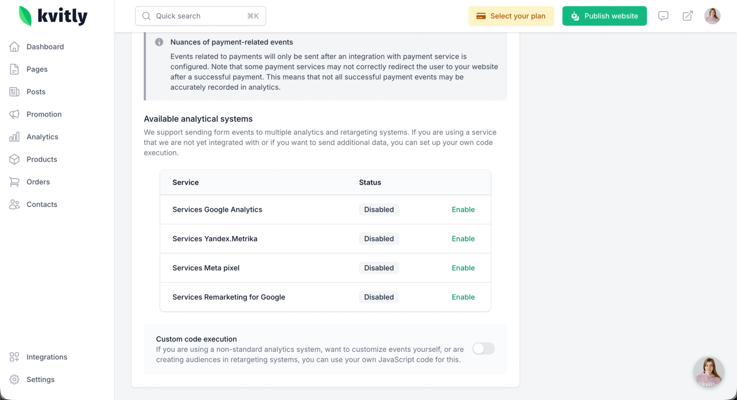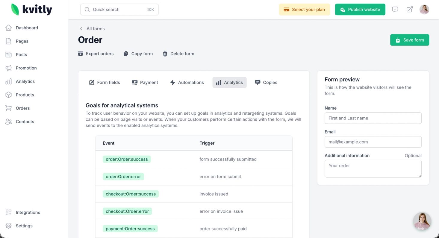 Events related to payments (payment:Order:success / payment:Order:error) will only be sent after you have configured an integration with a payment service (e.g., CloudPayments, PayPal and so on) in 🌱kvitly.
