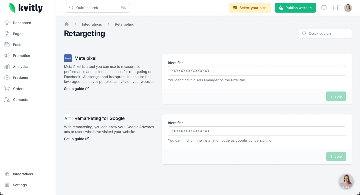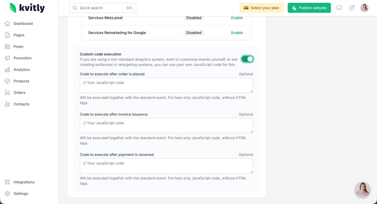 Using the goals settings, you can track user actions on your website, such as form submissions or payments, in analytics and retargeting systems like Google Analytics, Meta Pixel, or Yandex.Metrika. This is particularly useful for measuring advertising effectiveness, analyzing your sales funnel, and setting up remarketing campaigns.