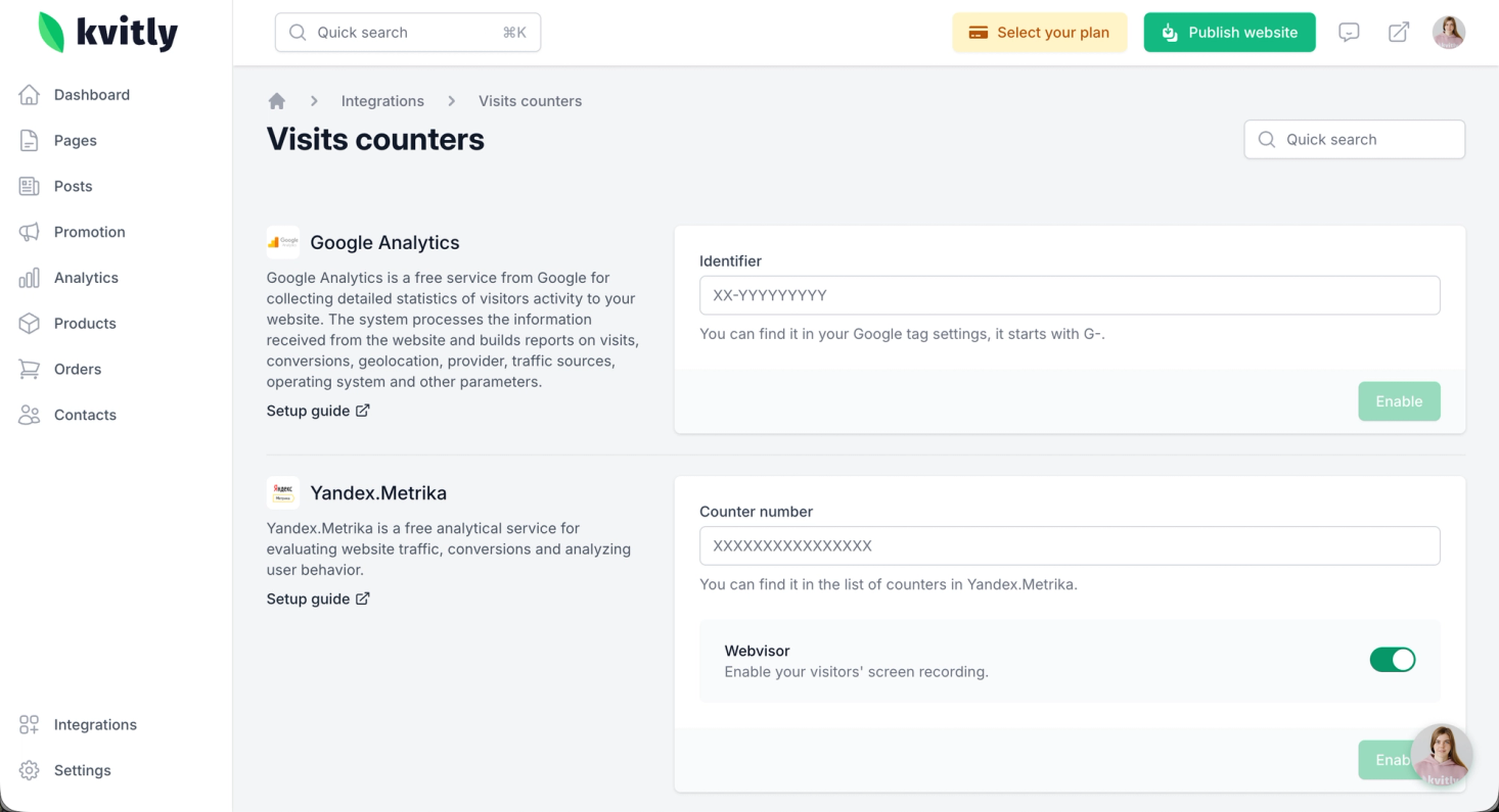 Important: For events to be delivered correctly, you need to add Integrations from the Visits counters page and Retargeting page.