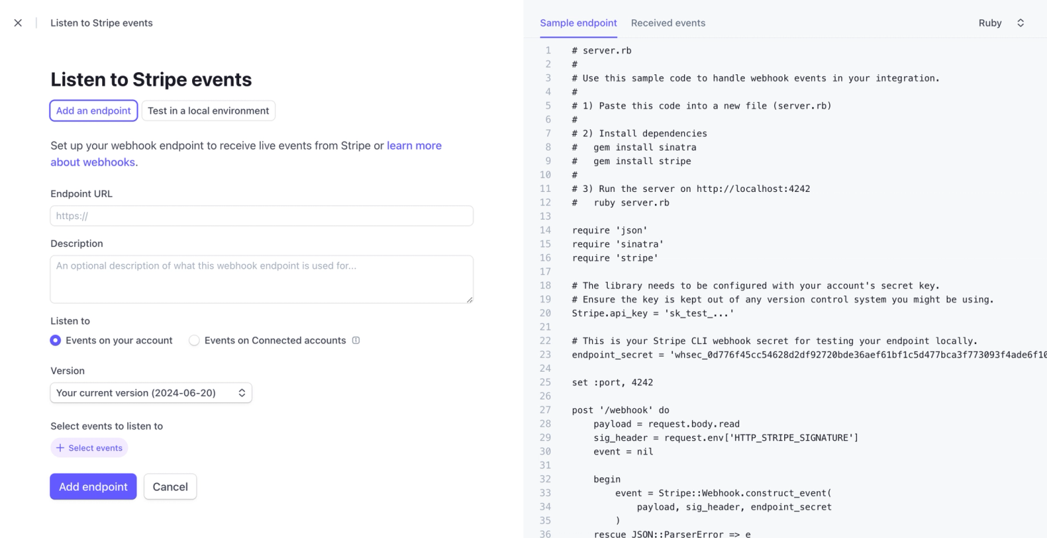 6. Once you’ve added everything, check your setup (it needs to have URL and 2 events selected) and click on Add endpoint.