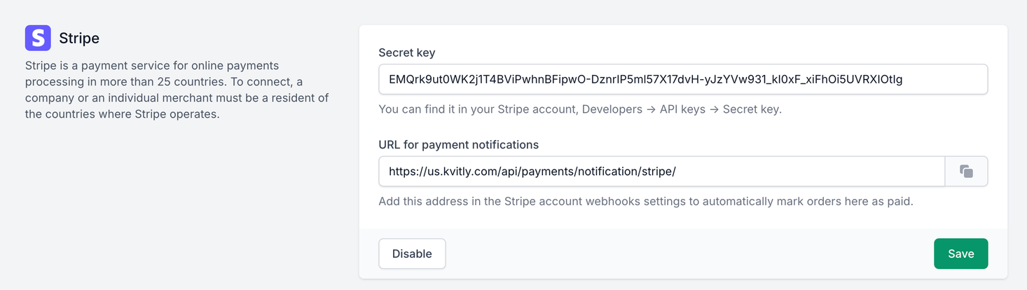 To enable integration with Stripe for your 🌱kvitly website, you need to have an account in Stripe. Once you register there, follow the instructions on the Stripe site to complete the setup. We need to find 2 keys in Stripe admin panel and copy them over to your 🌱kvitly website.