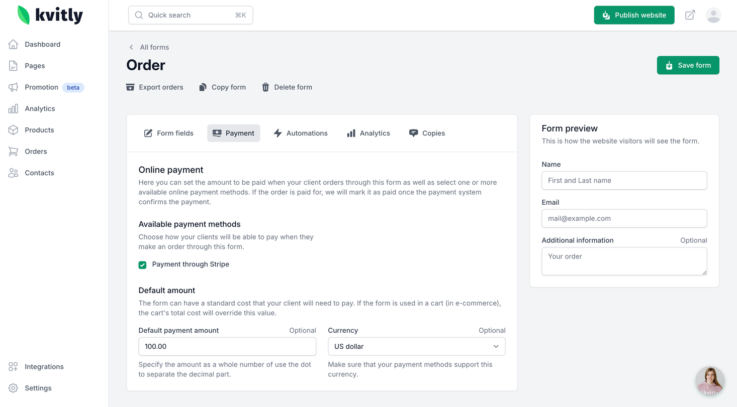 Once everything is saved and published, you will see the checkbox Pay online on your website form.