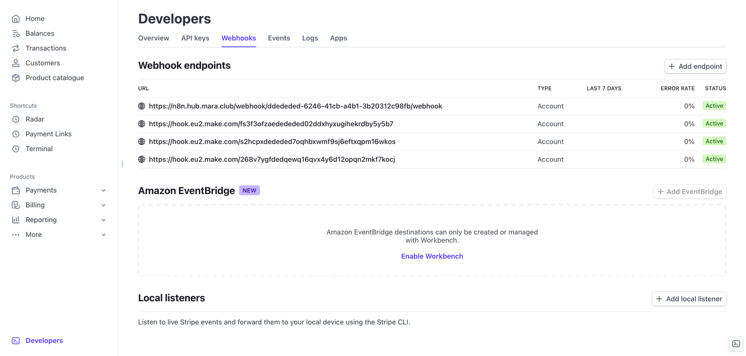 To complete the setup, we need to configure the webhooks. This is how Stripe system will let 🌱kvitly know that the order was paid. To do this, follow these steps: