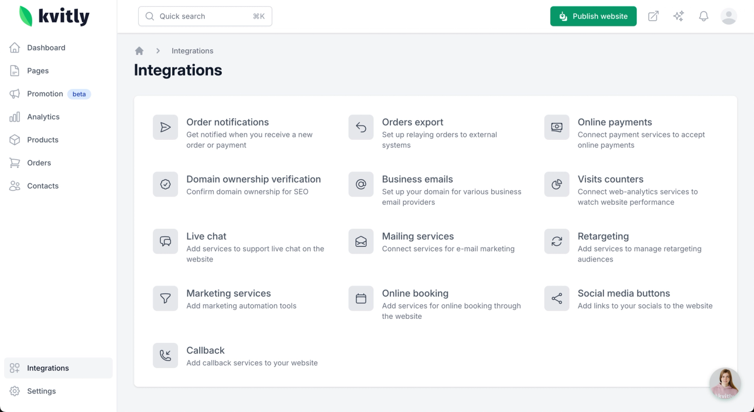 In more complex flows and business processes, it’s often necessary to take specific actions after receiving an order, such as notifying managers or adding data to a third-party system (i.e. the CRM that the company already uses). For these purposes, a special notification technology called Webhook is commonly used. Webhooks allow you to send orders data to any system when an event occurs on your site hosted on 🌱kvitly.