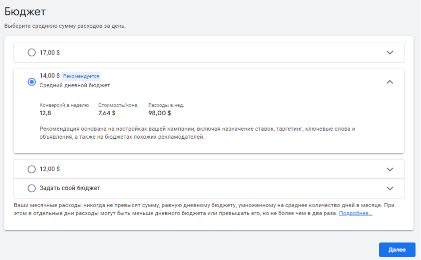 2. Установите Средний дневной бюджет — сумму, которую вы готовы тратить в день на рекламу. Вы можете выбрать предложенную сумму, либо ввести свою вручную.