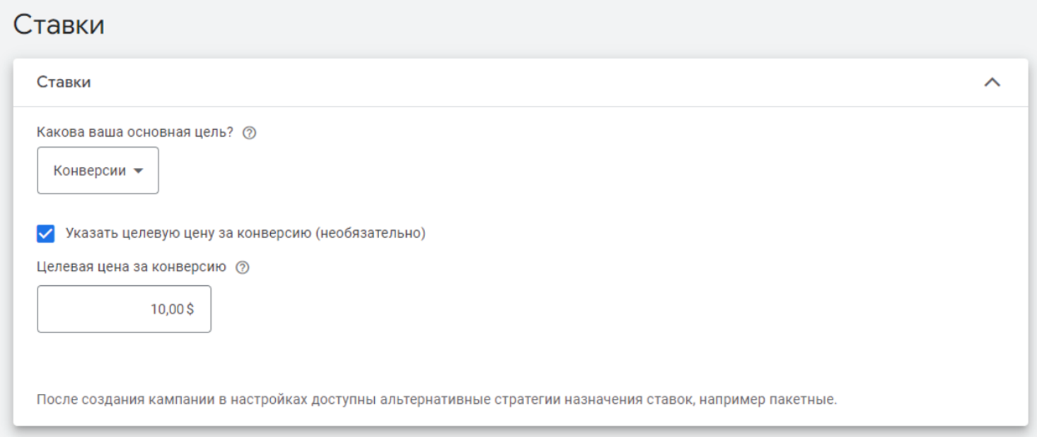 1. В разделе Ставки выберите модель оплаты за конверсии или клики. Например, можно выбрать Конверсии и указать целевую цену за конверсию.
