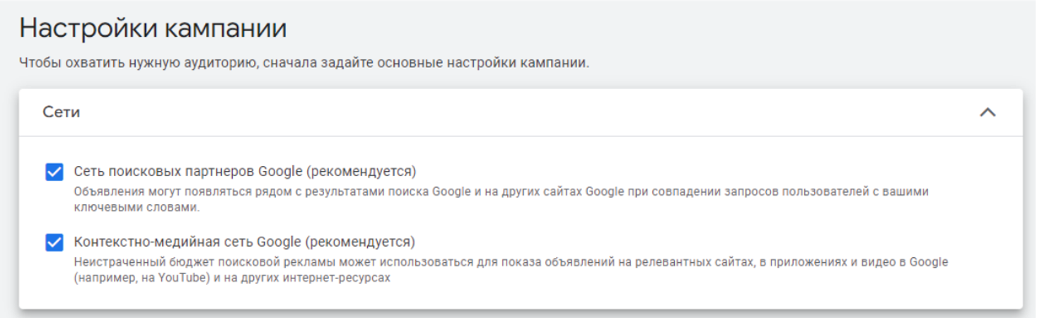 1. Сети — выберите, где будут показываться ваши объявления: