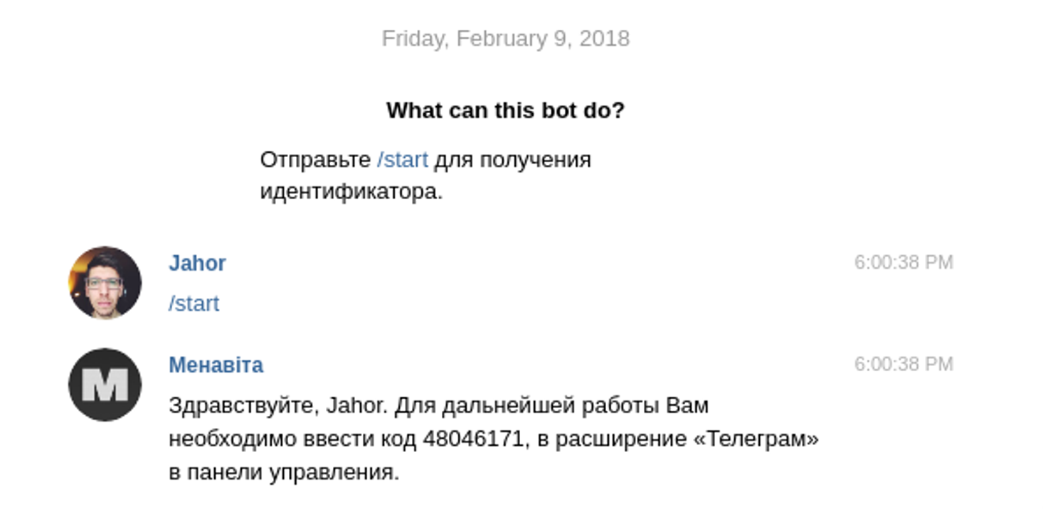 Затем найти нашего бота @MenavitaBot в телеграме и отправить ему сообщение /start