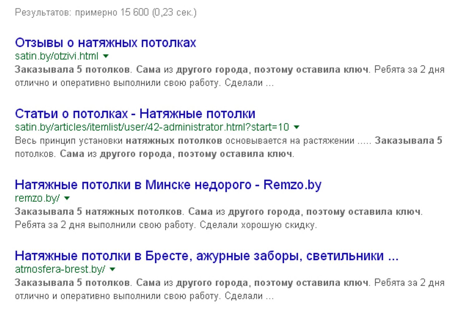 При создании отзывов ленятся даже переписать текст — его просто воруют с других сайтов. Проверить это достаточно легко — просто копируем часть текста и вставляем в поиск. Например, другой сайт по натяжным потолкам. Выглядит красиво, но давайте проверим текст отзывов.