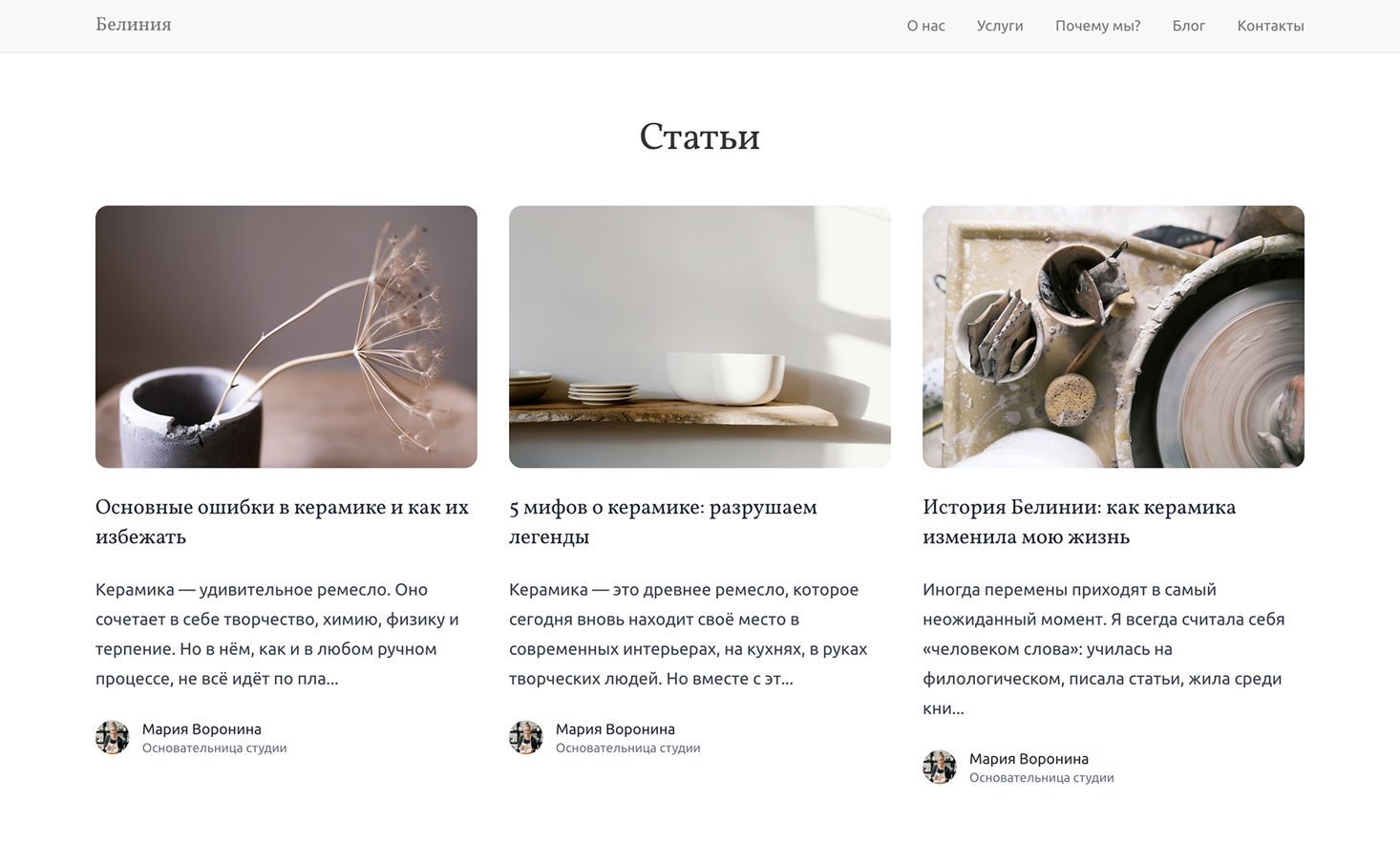 В панели управления появился новый раздел — Статьи. Работает он как каталог товаров, только для статей или новостей: вы добавляете заголовок, текст, обложку, категорию и автора, и при публикации сайта мы автоматически создаем отдельную страницу для каждой вашей статьи и для каждой категории.
