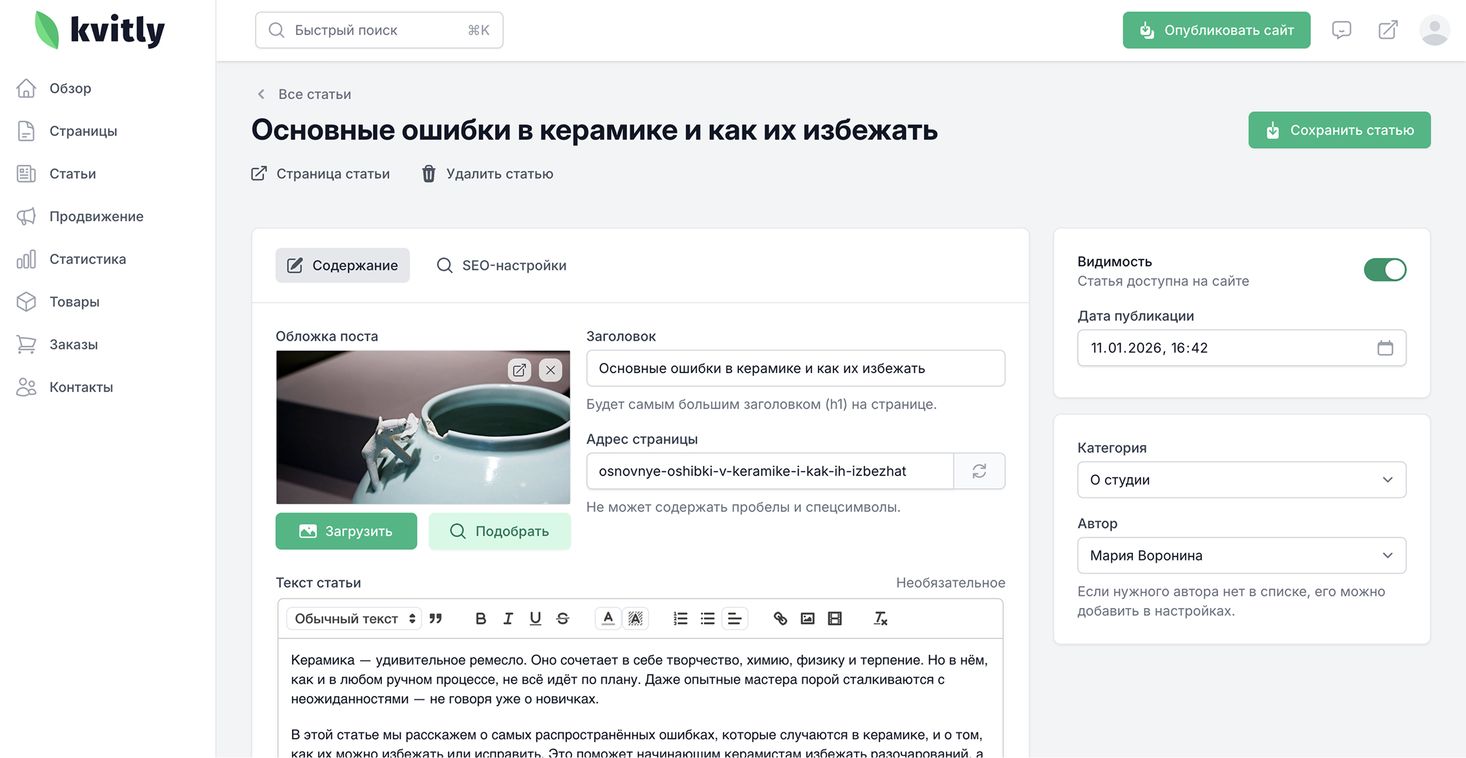 В 🌱kvitly появилась новая возможность — теперь на своем сайты вы можете публиковать Статьи! Это отличный способ вести блог, рассказывать новости, размещать полезные инструкции, подборки, кейсы или просто делиться мыслями и историями с вашими клиентами.