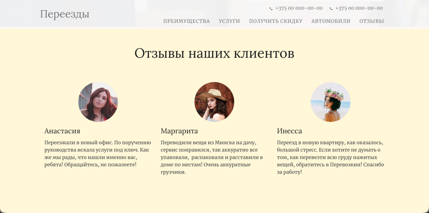 Как использовать: Добавьте отзывы клиентов с фотографиями и именами. Покажите примеры выполненных работ (кейсы).